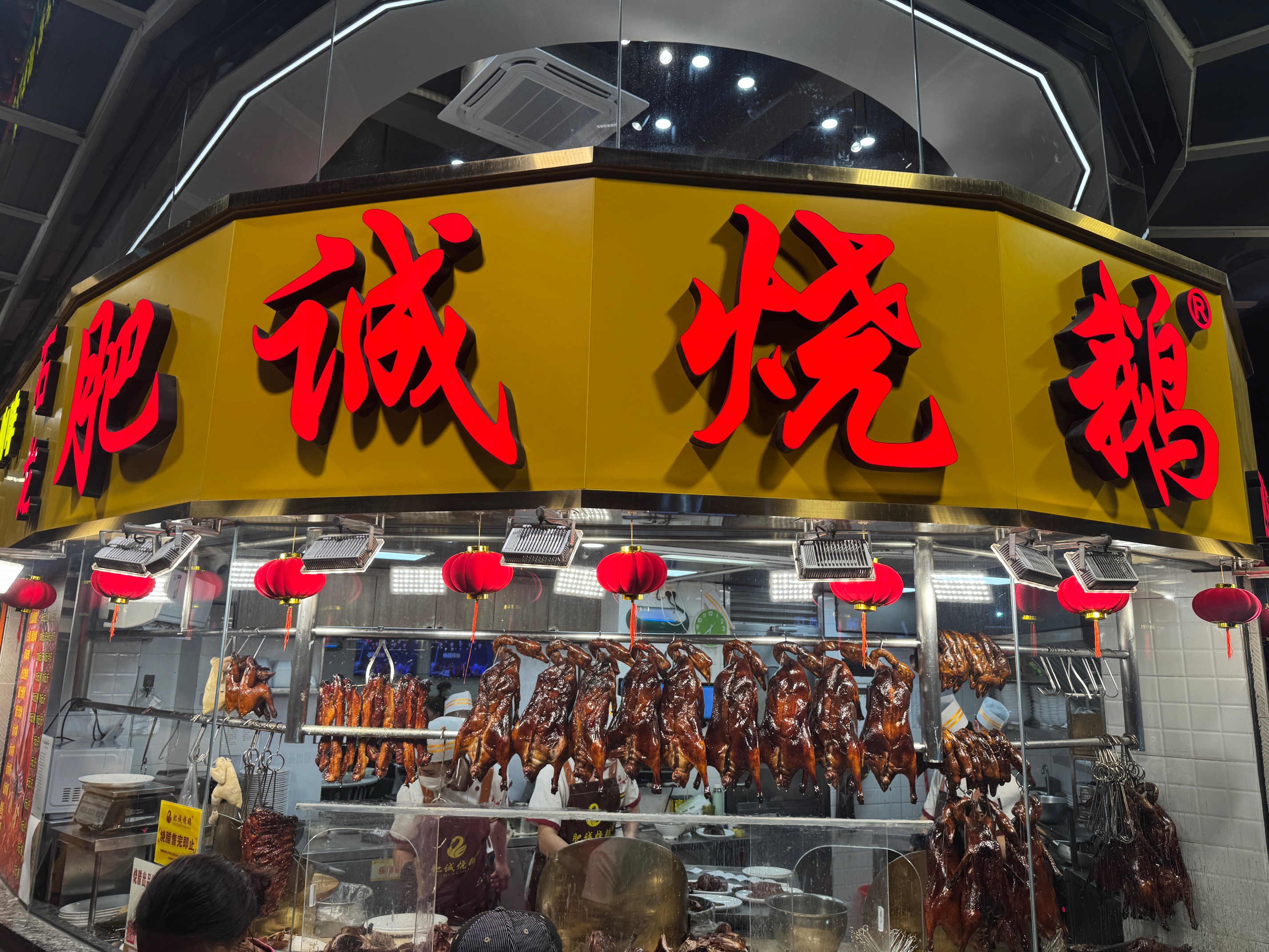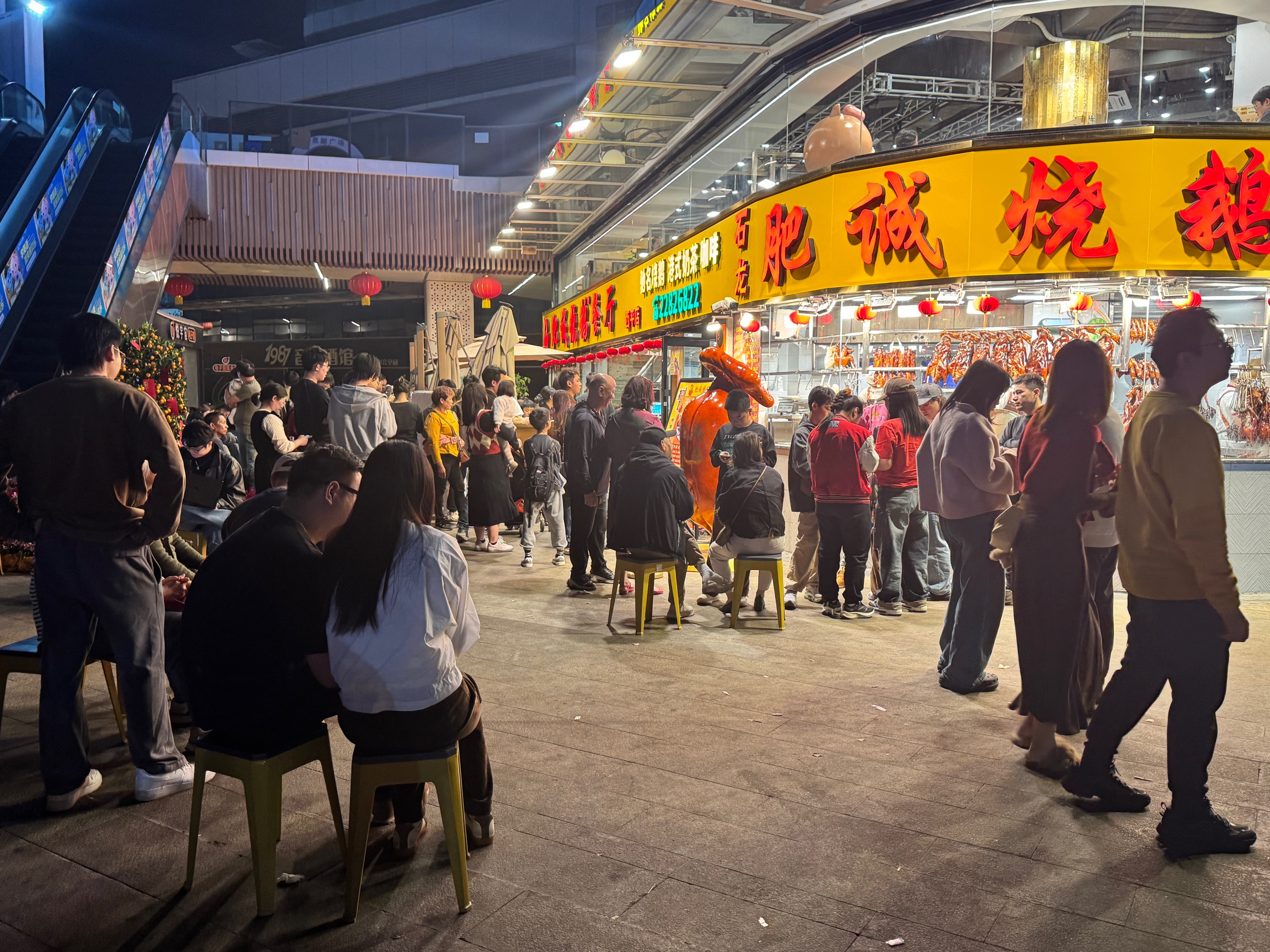 傍晚7时许,正是春节假期的用餐高峰期,肥诚烧鹅门店前早已排起长龙,取号机前的队伍一直延伸到人行道上,空气中弥漫着荔枝木烧制烧鹅的焦香与油脂香气。