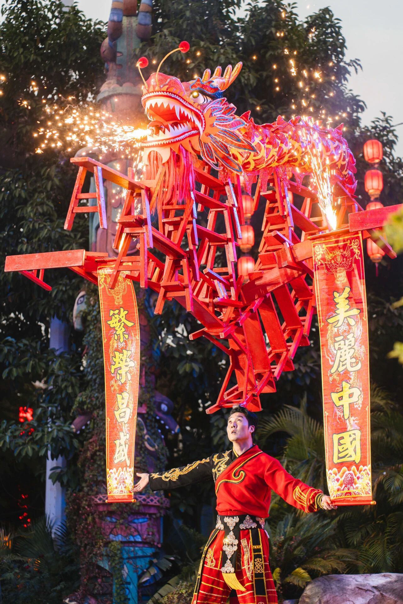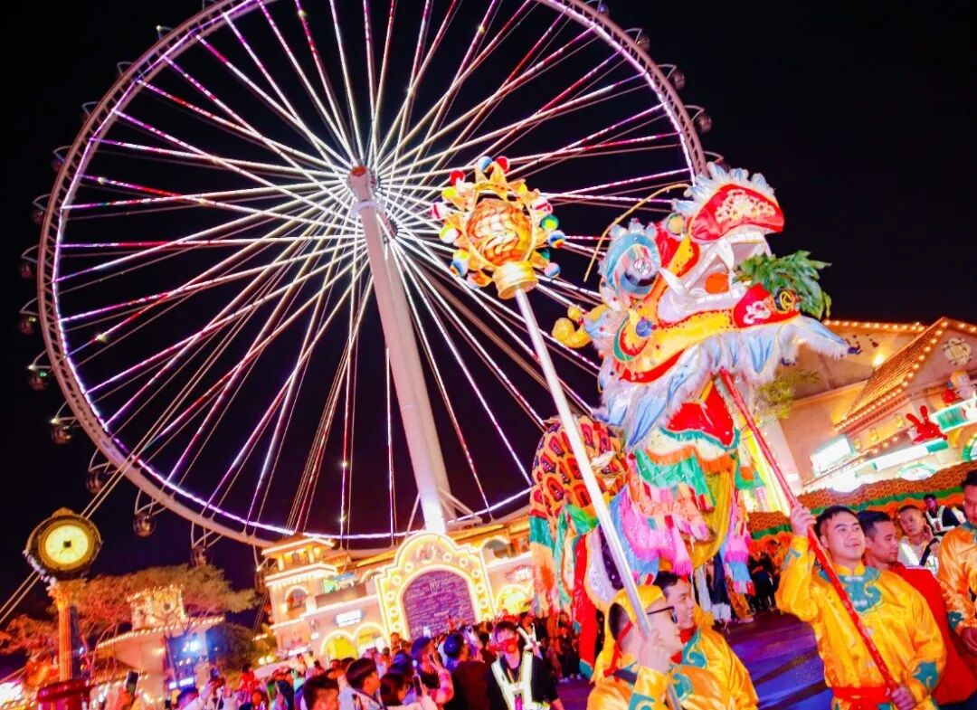 天湖公园每日三场黄飞鸿醒狮表演,还有国潮杂技、财神NPC定时巡游送福!
