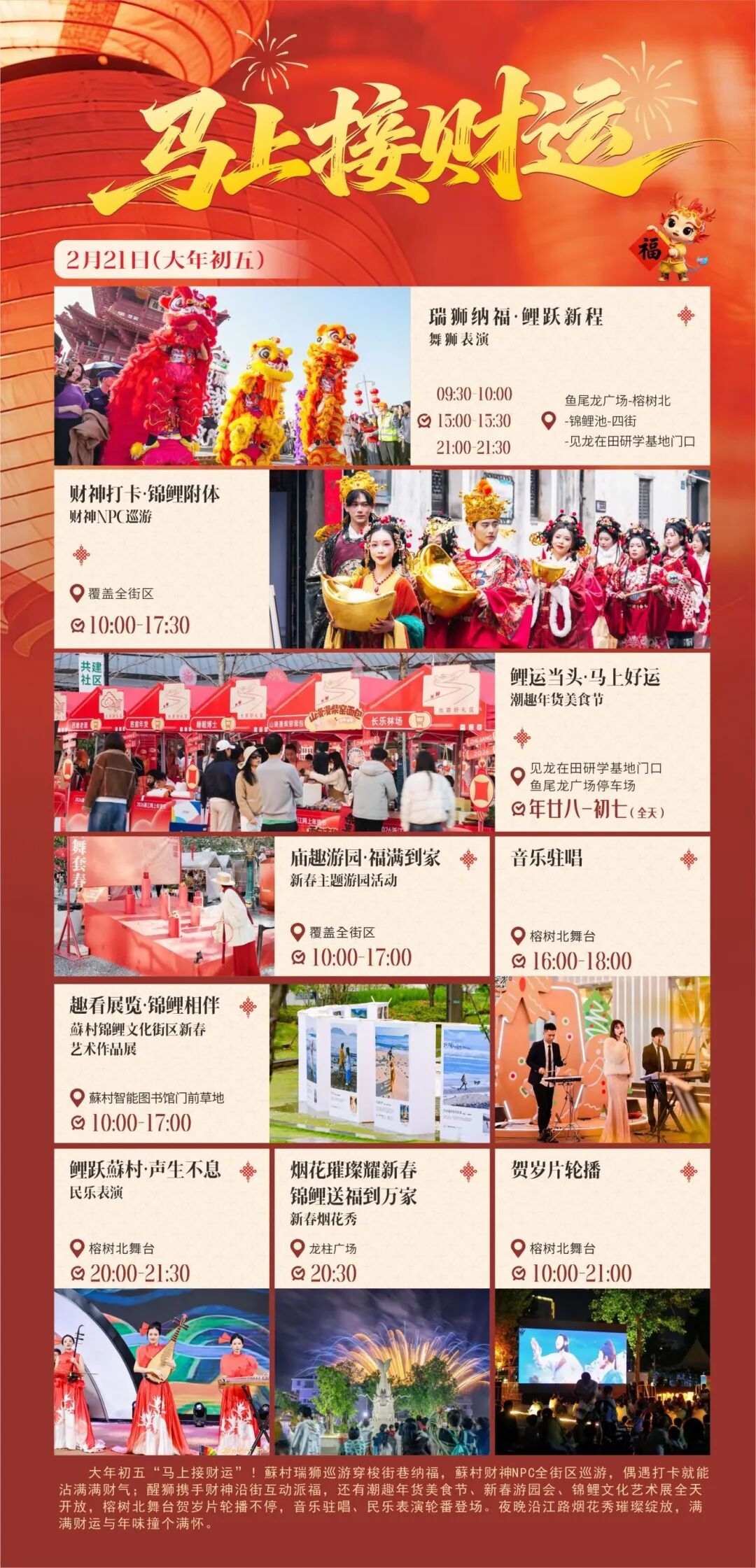 大年初五来苏村解锁双重快乐!潮流财神现场派福,国潮杂技、宫灯表演轮番上演,沉浸式感受民俗与潮玩的碰撞。看完醒狮表演再与财神打个卡,街区的好运随机掉落,还有好玩的庙会等着你!