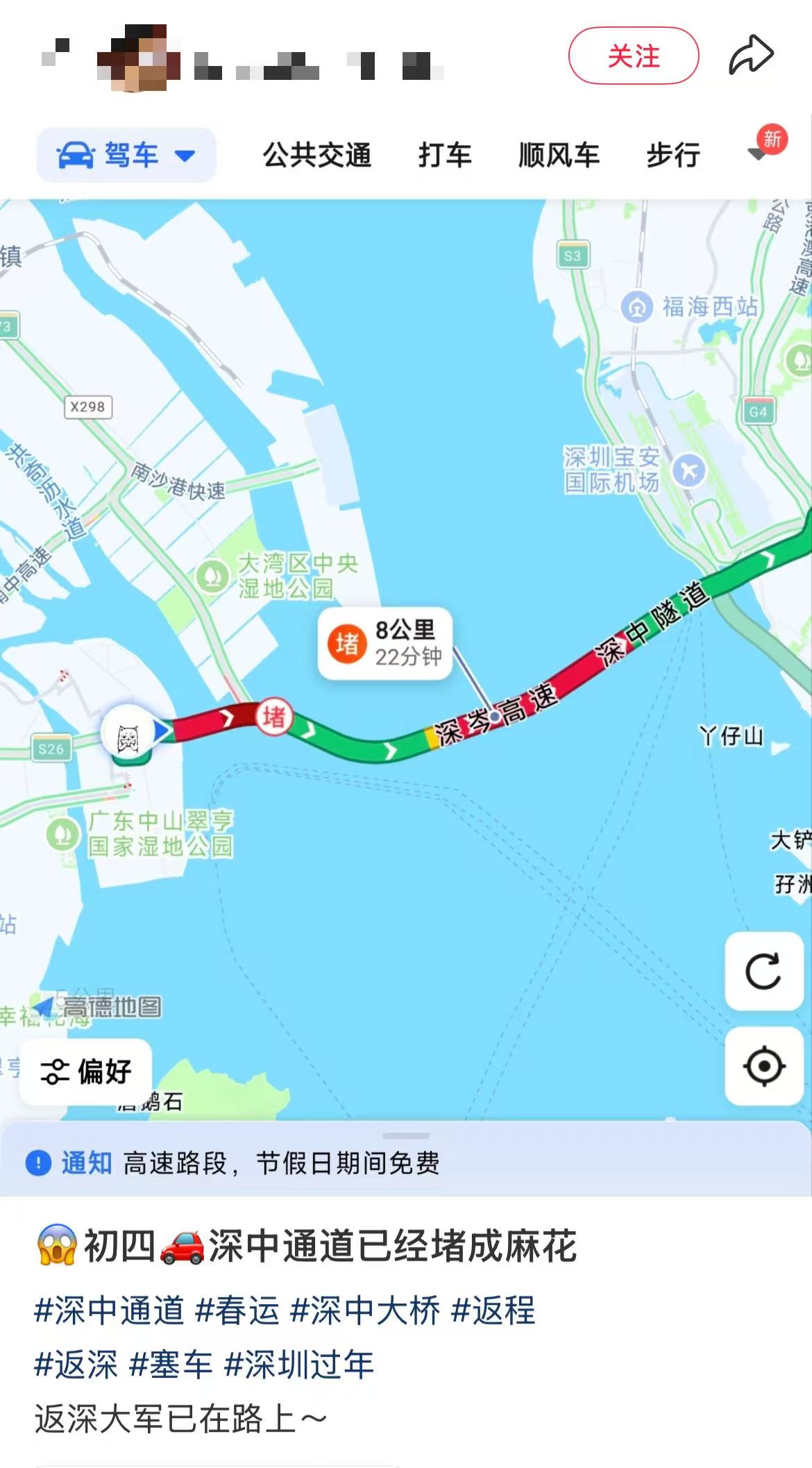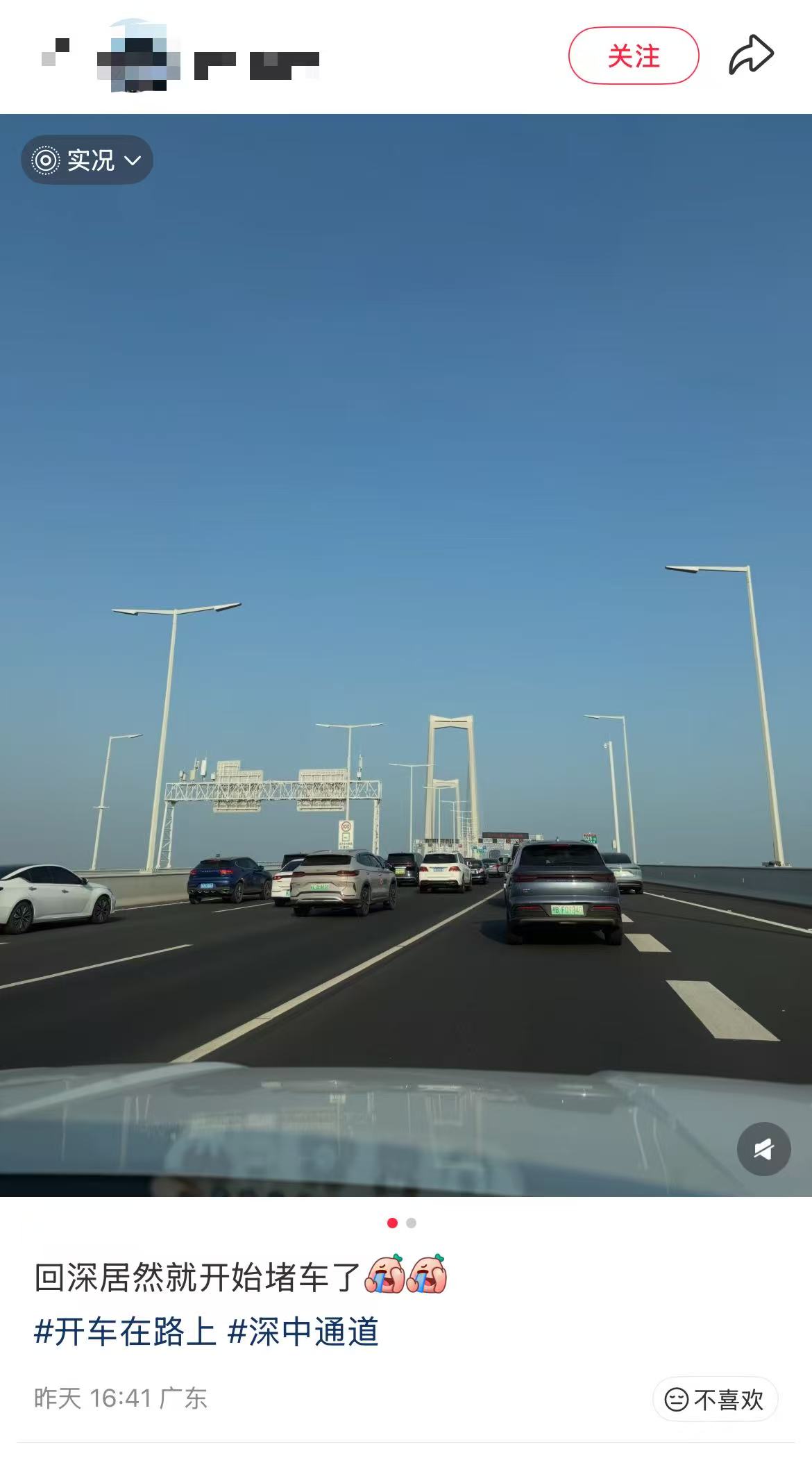 2月22日起至2月26日(正月初六至正月初十),预计深中通道向东行往深圳方向将出现拥堵;深中通道双向隧道口、中山往深圳方向万顷沙互通至西人工岛段在车流高峰期容易出现缓行或拥堵。