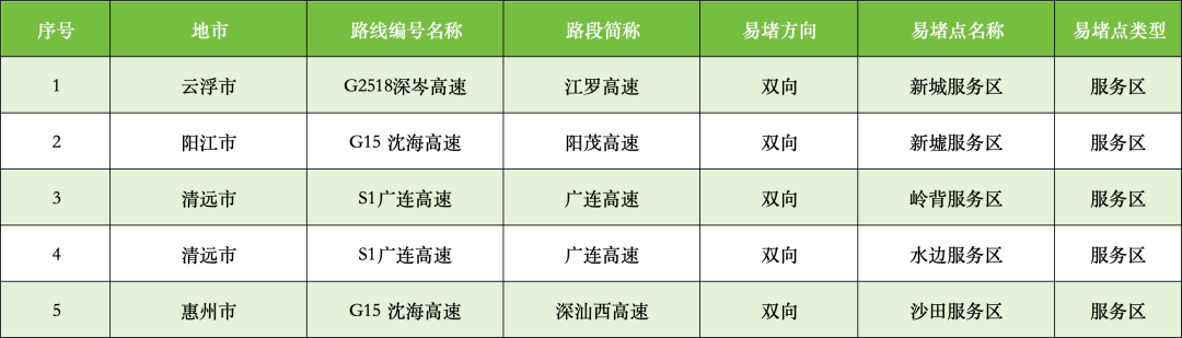 ◈G4W广澳高速城区段至翠亨段南行:由于沿线道路三车道逐步收窄为两车道,假期沿途车流量增多,导致该路段易现拥堵,诱发剐蹭事故。