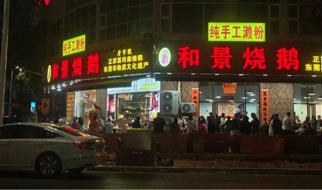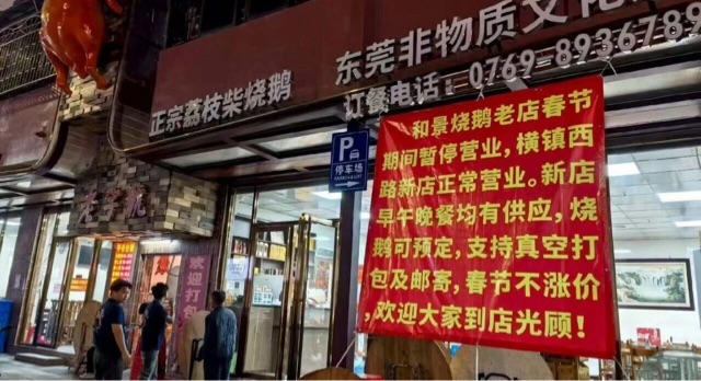 作为大岭山美食名片、东莞非物质文化遗产的荔枝柴烧鹅,其魅力在春节期间尤为凸显。部分知名烧鹅店坚守岗位,坚持春节不放假、菜品不涨价,让大岭山荔枝柴烧鹅持续飘香,店门前等候打包或堂食的食客络绎不绝。大年初一晚上7点,位于横镇西路的和景烧鹅店门前就排起了长长的队伍,不少本地居民和周边游客专程前来,只为一口醇正地道的荔枝柴烧鹅。