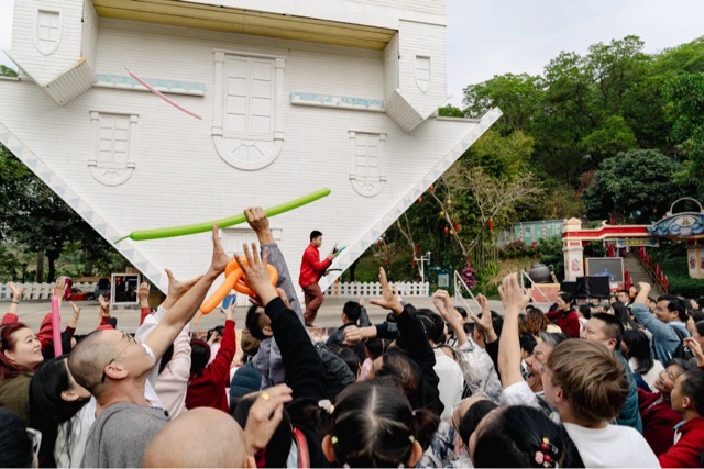2月20日上午,龙凤山庄正门广场上,气势恢宏的迎宾表演准时拉开序幕。欢快的舞蹈与灵动跳跃的舞狮交相辉映,瞬间将来自四面八方的游客带入喜庆祥和的新春氛围之中。随后在皇室古堡广场上演的方头小花儿童剧,吸引了众多亲子家庭驻足围观,孩子们与卡通人物亲密互动,现场欢笑声不断。
