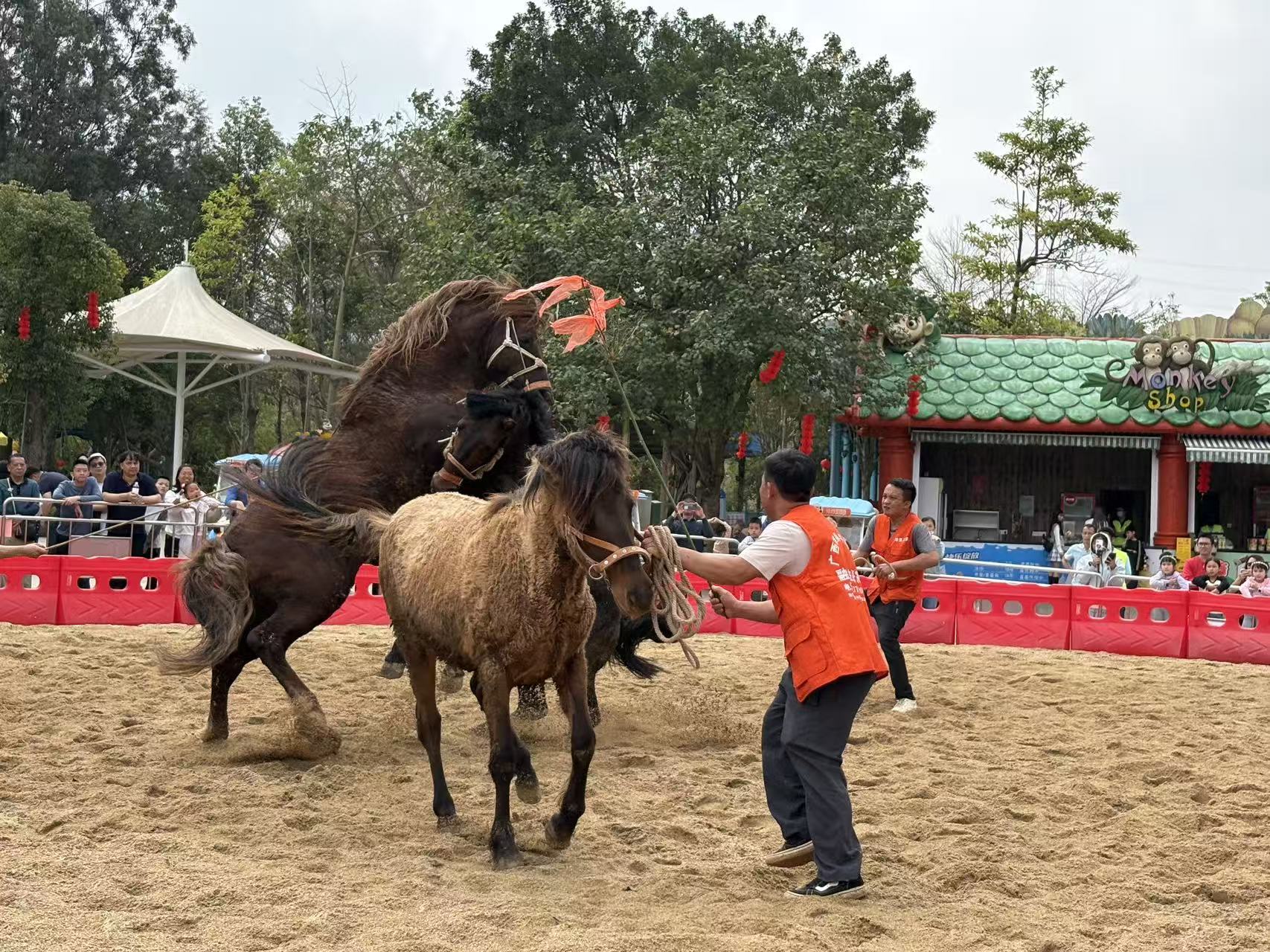 高明区鹭湖花园酒店、山影云居等多家知名酒店、民宿连日来“一房难求”。鹭湖花园酒店传讯部黄嘉盈介绍:“今年春节天气回暖,客人出行意愿高。我们酒店从大年初二开始,一连四天,天天六店满房。景区最大亮点是2026年探索王国首届斗马文化节活动,来自广西的7匹‘斗马勇士’轮番上阵,骑手身着苗族盛装,马匹披红挂彩,场面十分震撼。”
