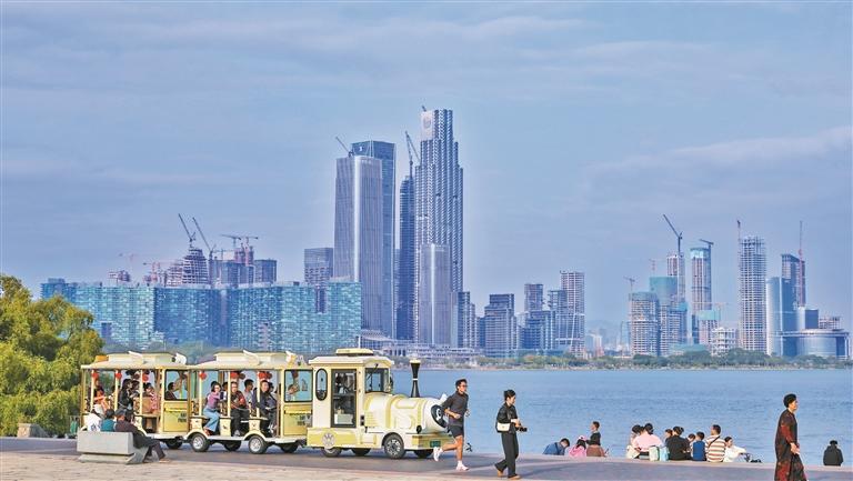 市民游客乘坐深圳湾公园观光小火车赏湾区美景。
