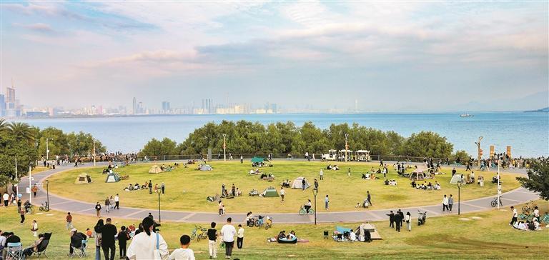 在深圳湾公园日出剧场,众多市民陪着家人休憩游乐,共享美好假日时光。