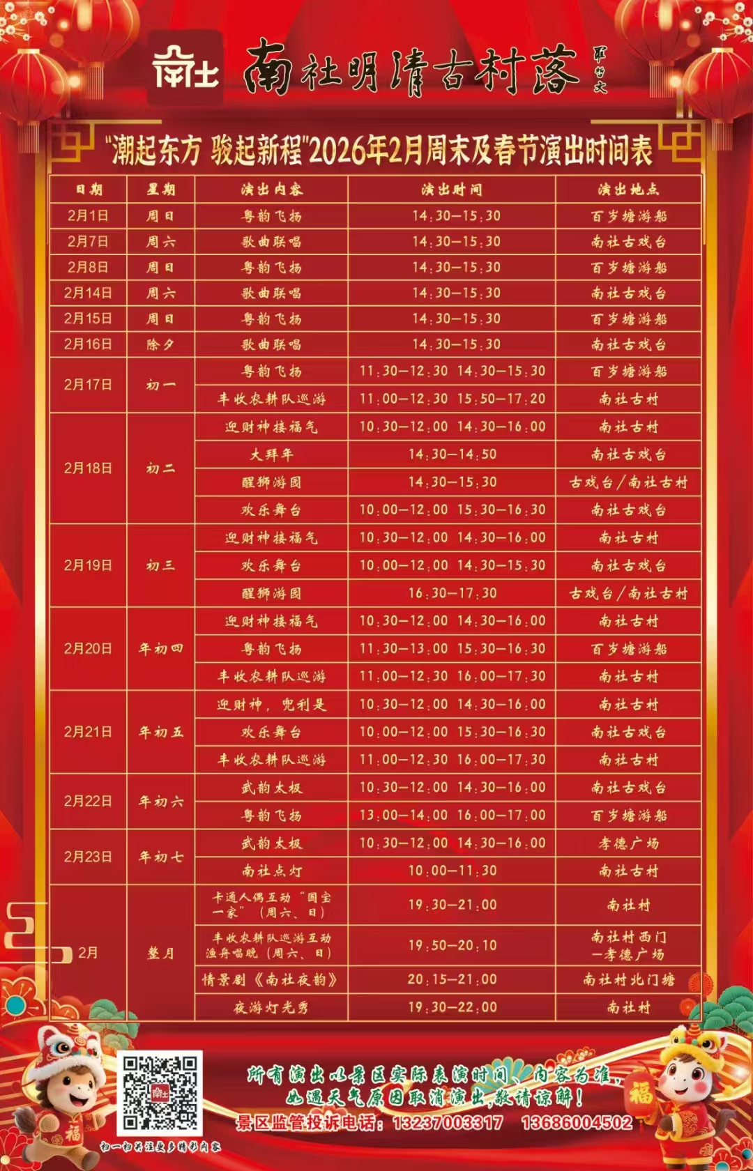 “我们的目标很简单:活动热闹但不杂乱,游客多但不拥挤,让每一位来到南社的朋友,都能乘兴而来、满意而归。”陈玲说。在策划节假日活动时,她围绕文化、游客、安全、体验四个核心精准发力:兼顾不同人群需求,老人喜欢的传统年味、年轻人热衷的打卡互动、小朋友偏爱的趣味体验有机结合;结合时节营造仪式感,让传统年味和岭南风情扑面而来。安全底线同样守得牢靠,春节假期前专门开展消防安全应急演练,增强景区工作人员和游客的安全防火意识,提升突发事件处置能力,确保所有活动有序、可控、舒心。