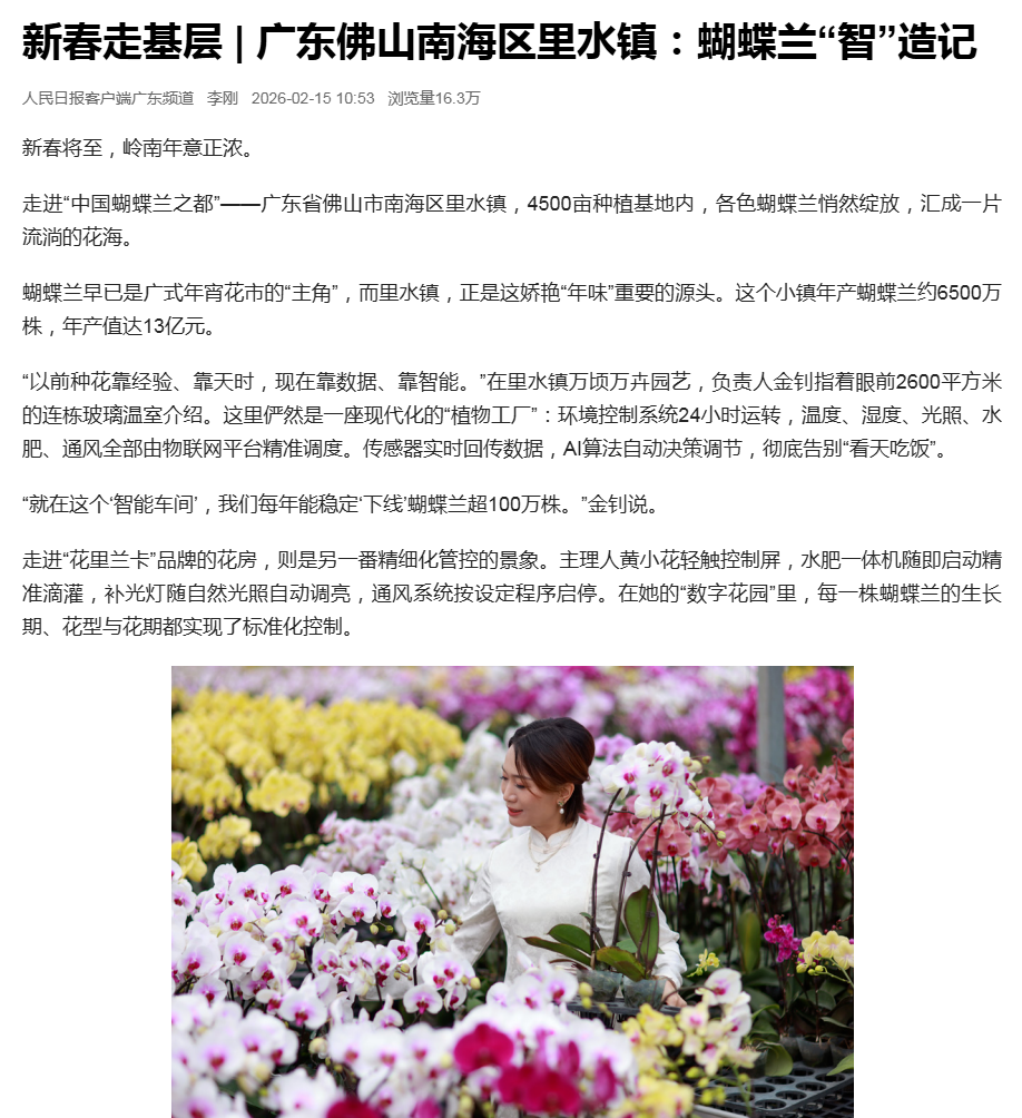 2月15日,人民日报客户端以《新春走基层|广东佛山南海区里水镇:蝴蝶兰“智”造记》为题,报道里水镇通过引入物联网、AI算法等智能化技术,推动蝴蝶兰产业从传统种植向现代化“植物工厂”转型,实现了年产值13亿元的富民增收大产业,为中国年添上一缕可复制、可推广的科技芬芳。
