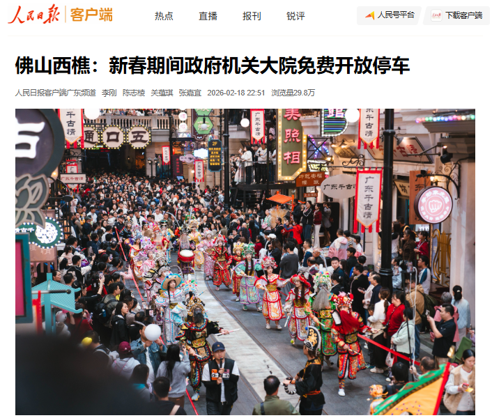 春节期间,南海的城市治理举措成为央媒报道的亮点。正月初二,人民日报客户端以《佛山西樵:新春期间政府机关大院免费开放停车》为题,报道春节假期期间,西樵镇政府机关大院、镇公资办大院、中国农业银行西樵支行停车场全天免费开放,喜迎八方来客。小小的停车位,彰显的是南海开门迎客的诚意与服务群众的初心。