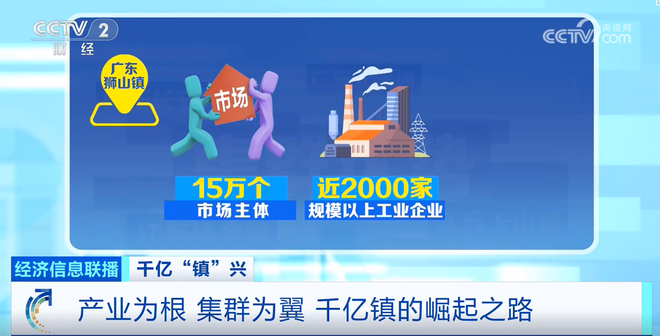 同样被央视“看见”的,还有镇域经济的标杆——狮山镇。春节前夕,央视财经频道连续四天聚焦,推出千亿“镇”兴系列报道,分别以《产业为根 集群为翼 千亿镇的崛起之路》《创新引擎轰鸣 千亿镇领跑镇域经济新赛道》《精准赋能 以科创服务激活人才活力》为题,深度解读狮山产业发展密码。这座连续五年位居中国镇域高质量发展500强首位的产业强镇,坐拥15万个市场主体、近2000家规模以上工业企业、超1300家高新技术企业,在汽车整车及零部件制造、有色金属等领域构筑起千亿级产业集群,更形成了以产聚才、以才兴产、产才融合的良性发展新格局。