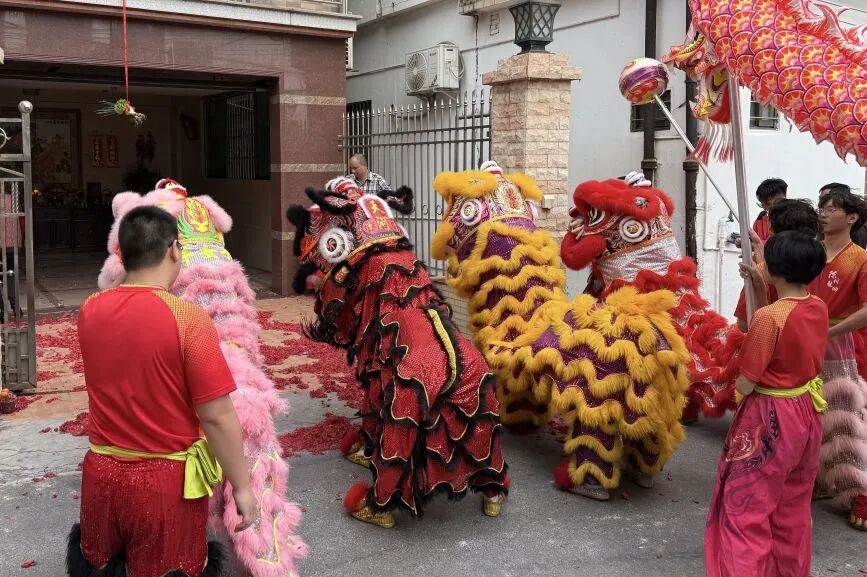 巡游涵盖游龙献瑞、醒狮巡演、入户采青及沿街送福等环节。长龙时而盘踞时而飞舞,醒狮踏着鼓点腾挪跳跃,沿途向居民拱手拜年。在深受欢迎的“采青”环节,沿街商户将生菜等吉祥物悬挂高处,瑞狮施展技艺“食青”后吐青,寓意“生财有道”。活动吸引众多居民驻足拍照,社区处处洋溢着欢声笑语。
