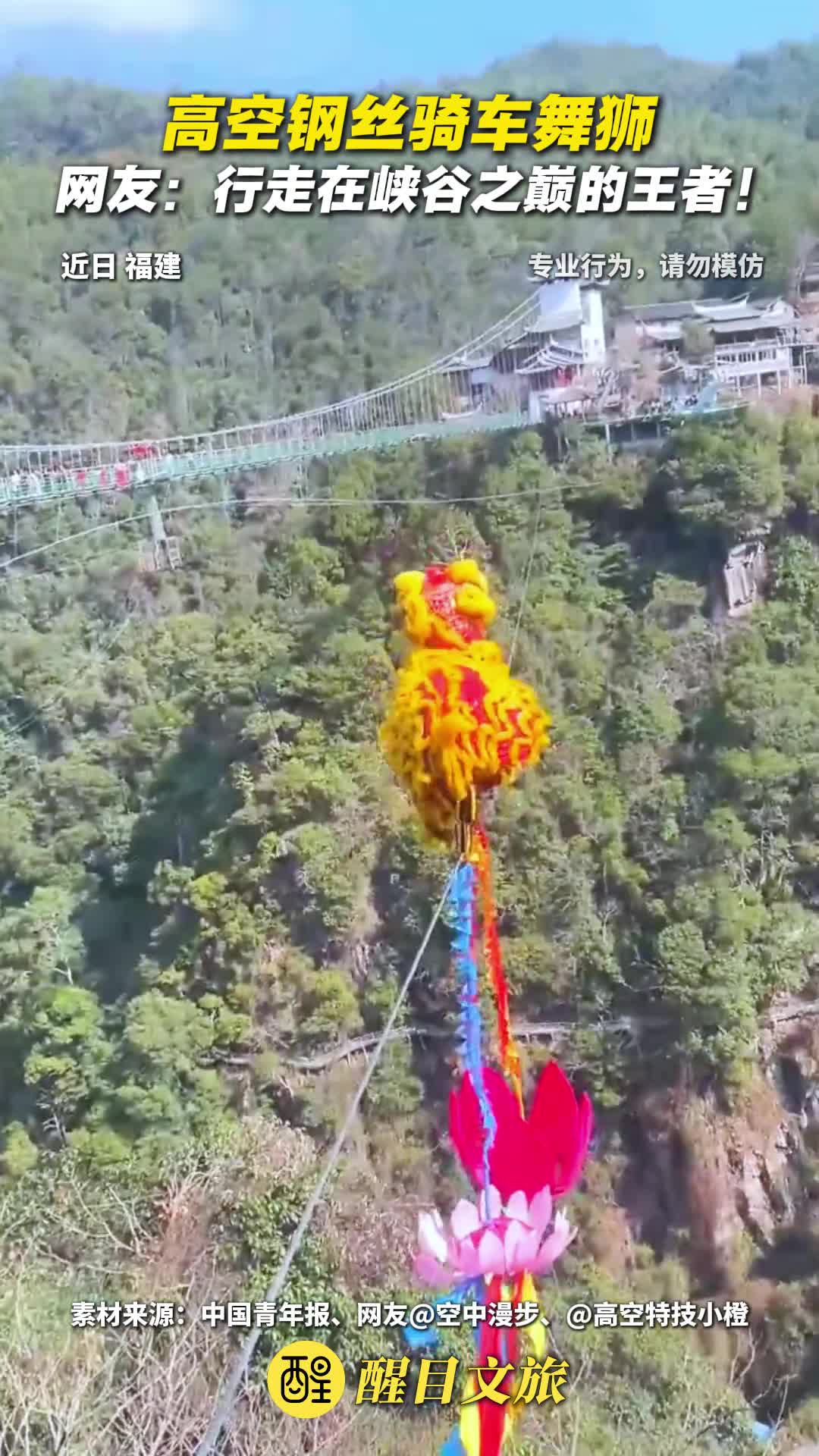 近日,福建侠天下景区,河南空中漫步艺术团在拉钢丝跨度256米,垂直谷底168米的峡谷景区中,上演高空钢丝骑车舞狮。(编辑:胡煜;责编:梁铭鼎;素材来源:中国青年报、网友@空中漫步、@高空特技小橙) #舞狮 #杂技 #走钢丝 #骑车