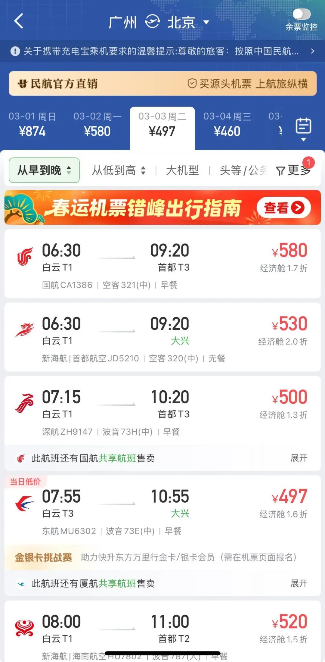 3月3日元宵节当天,广州—北京机票价格400元至600元。