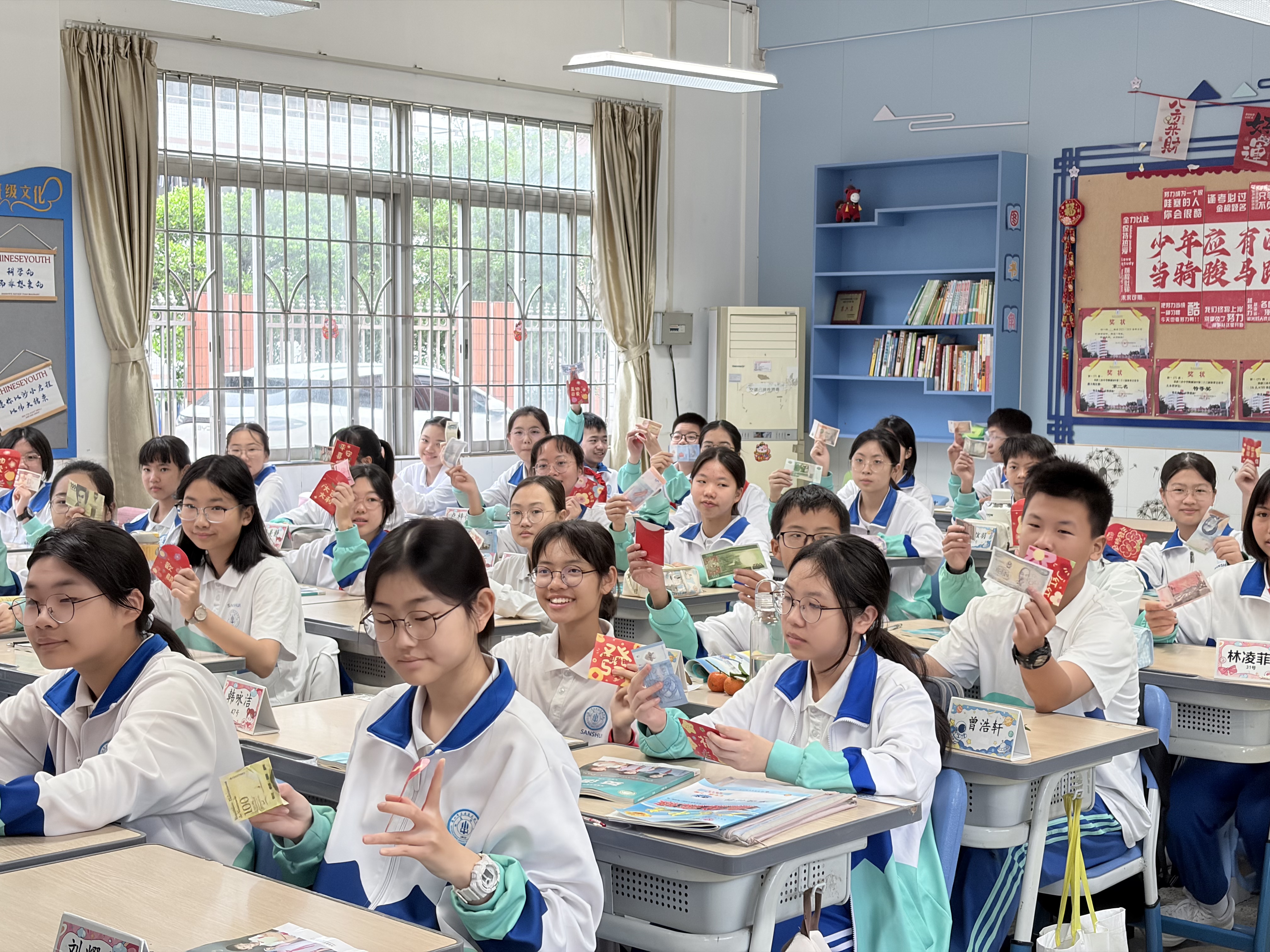 三水中学附属初中:开学英语课收外币利是 激发探索世界兴趣