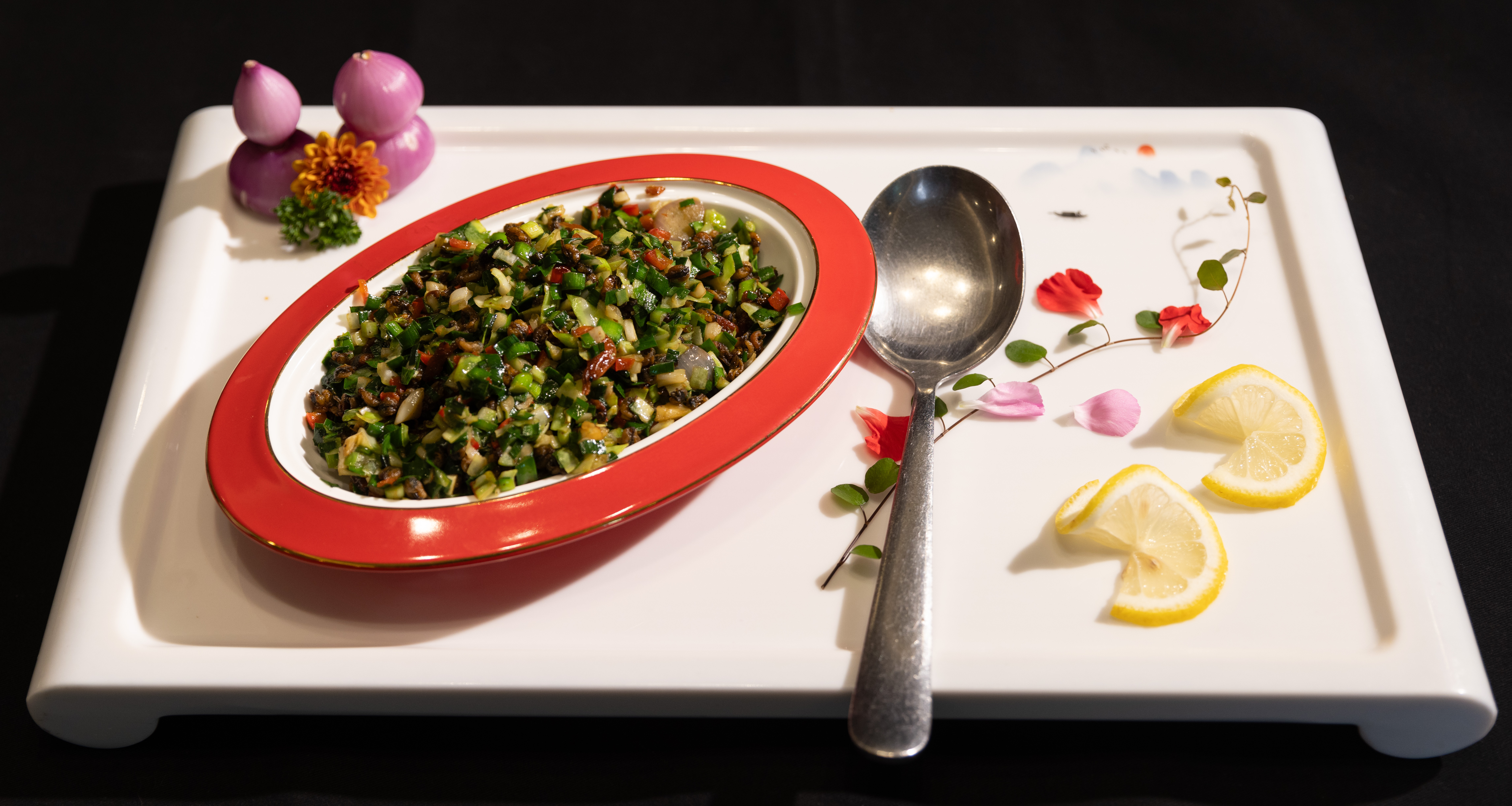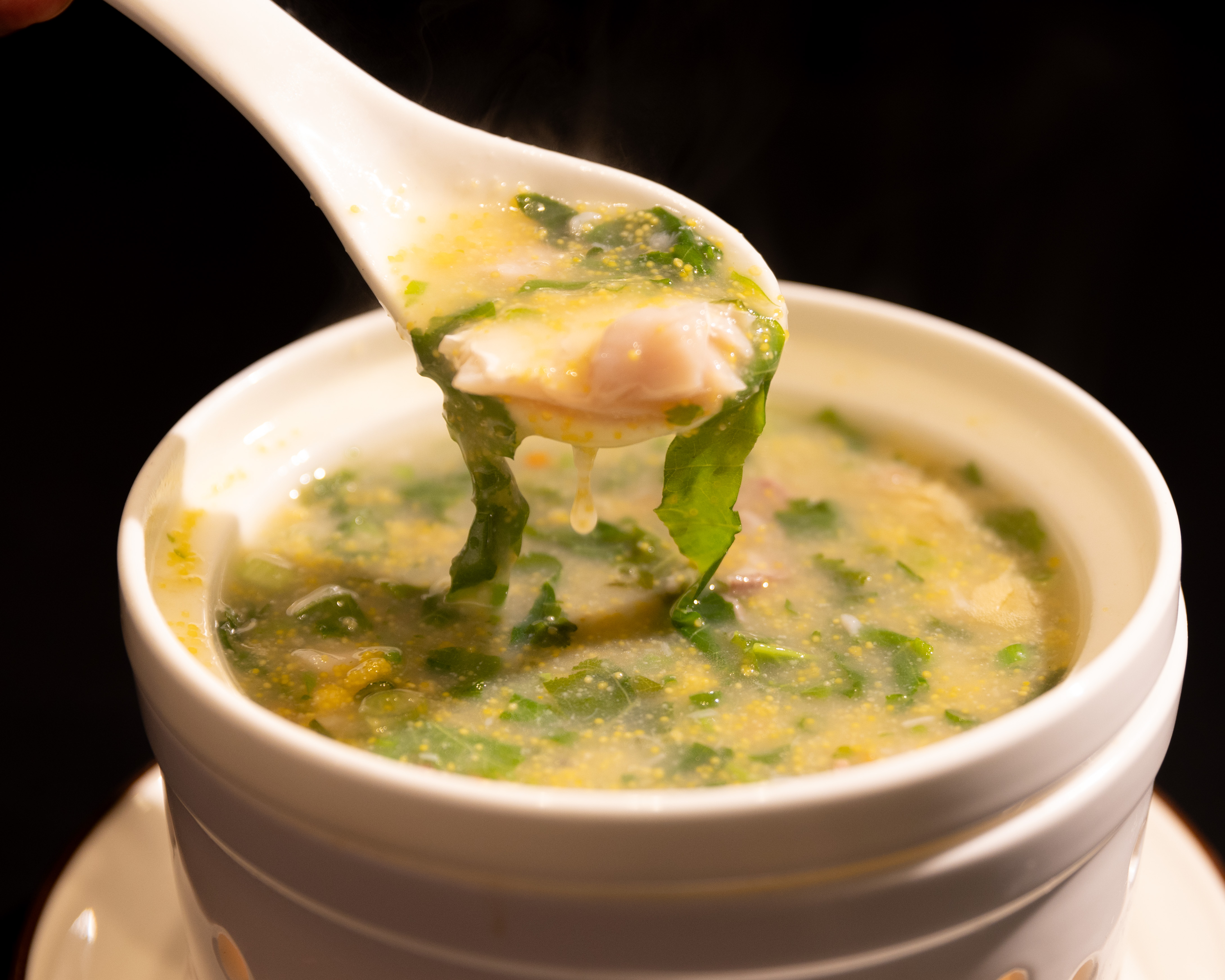 桑叶鱼蓉羹,取桑枝最嫩的头茬桑叶,鲫鱼去骨起肉。文火慢熬,汤色温润如玉,鱼蓉绵密细腻,桑叶的清冽悄悄化解鱼腥,只留满口鲜润回甘。一碗入喉,滋养身心。