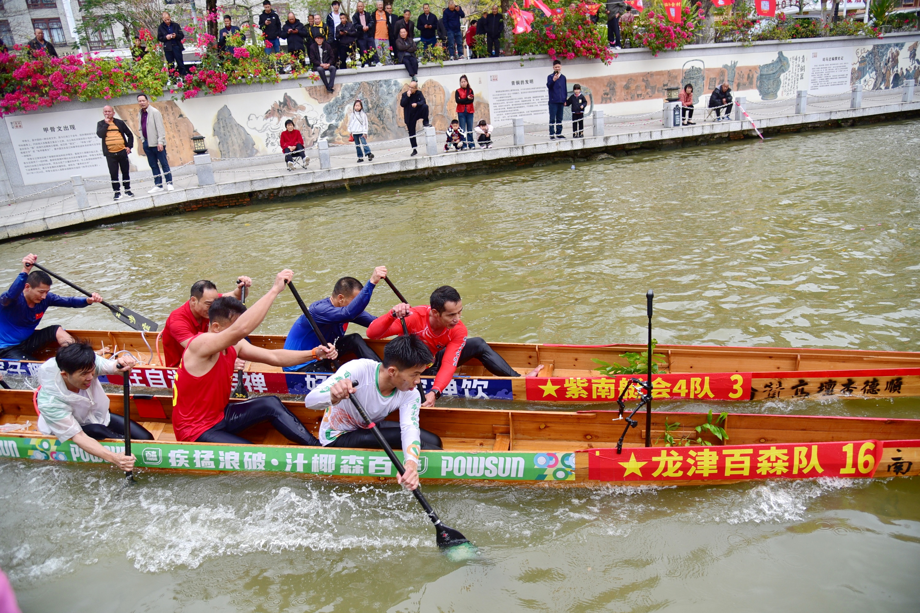 不同于龙舟的 “重装坦克”,本次赛事的 “参赛座驾” 是珠三角水乡独有的草艇 —— 身形窄长、灵活如蛇,是疍家人穿梭河涌的看家本领,对选手的平衡感、爆发力要求拉满!而赛道更是狠活拉满,南庄紫南知名的 “水上F3魔鬼赛道”,全程9.3公里,绕赛道4圈、第5次冲过龙门才算胜利。这是耐力与技术的极限大考,每一次划桨、每一次转向,都是心跳加速的极致体验!