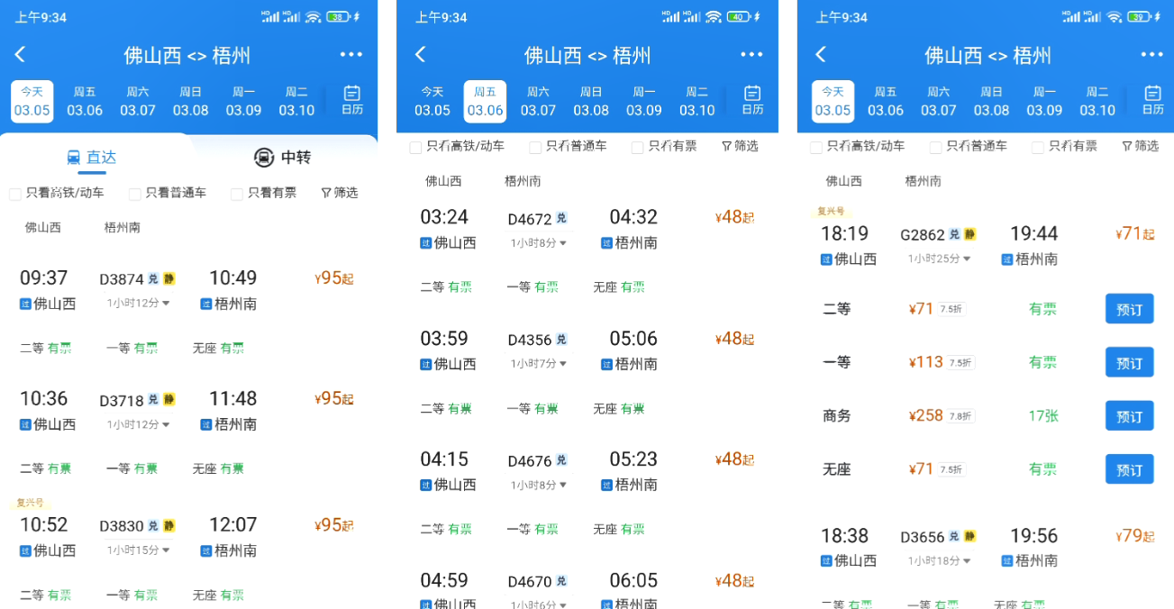 昨天(3月5日)上午,记者登录12306平台查询发现,从佛山西站出发,确实有不少低价票:最低48元可到梧州南站,最低124元可到贵阳站,最低167元可到重庆西站。