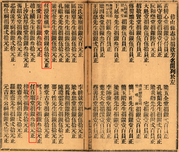 比如,道光十一年(1831年),时任大魁堂值事的任元梓与举人冼沂等重新制定赈济章程,规范义仓管理。道光二十年(1840年),任应垣与举人莫健翎、吴弥光等义仓值事募款殓葬流尸,彰显人文关怀。咸丰元年(1851年),任氏家族参与重修祖庙,任应垣、任本义联合绅士敬献“辰居式焕”牌匾。咸丰四年(1854年),任本皋参与筹办佛山团防局事务,守护地方安宁。民国佛山修志期间,任荫昌是倡修绅董之一,任氏家族以任澄波祖承裕堂、任百顺堂、任敬慎堂名义参与捐款,支持修志事业,为留存佛山地方历史贡献力量。