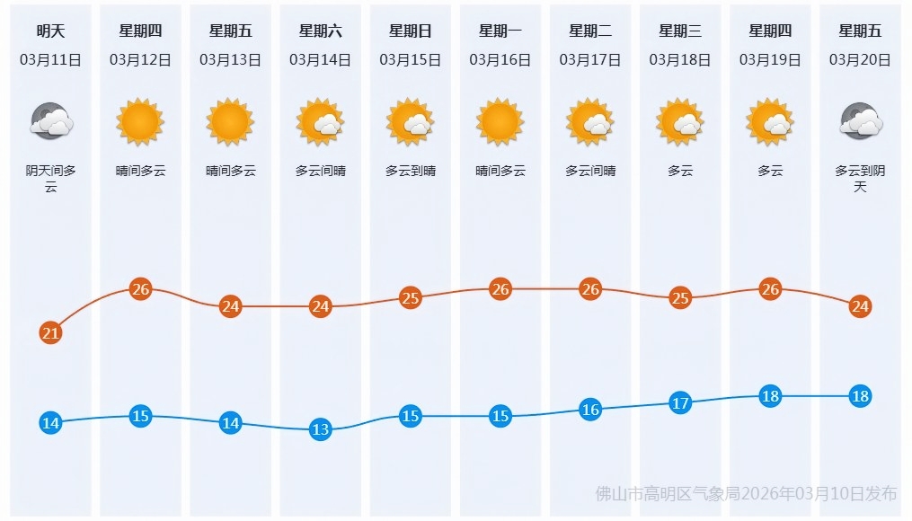 记者从高明区气象台获悉,3月10日新一波弱冷空气影响高明,受冷空气与切变线共同作用,全区阴天间多云,局部有零星小雨,空气湿度偏高,以湿冷天气为主,体感偏凉。根据最新气象监测数据,今日高明早晨最低气温12.9℃,较昨日同期下降6.3℃,白天最高气温16.3℃,日温差较小。