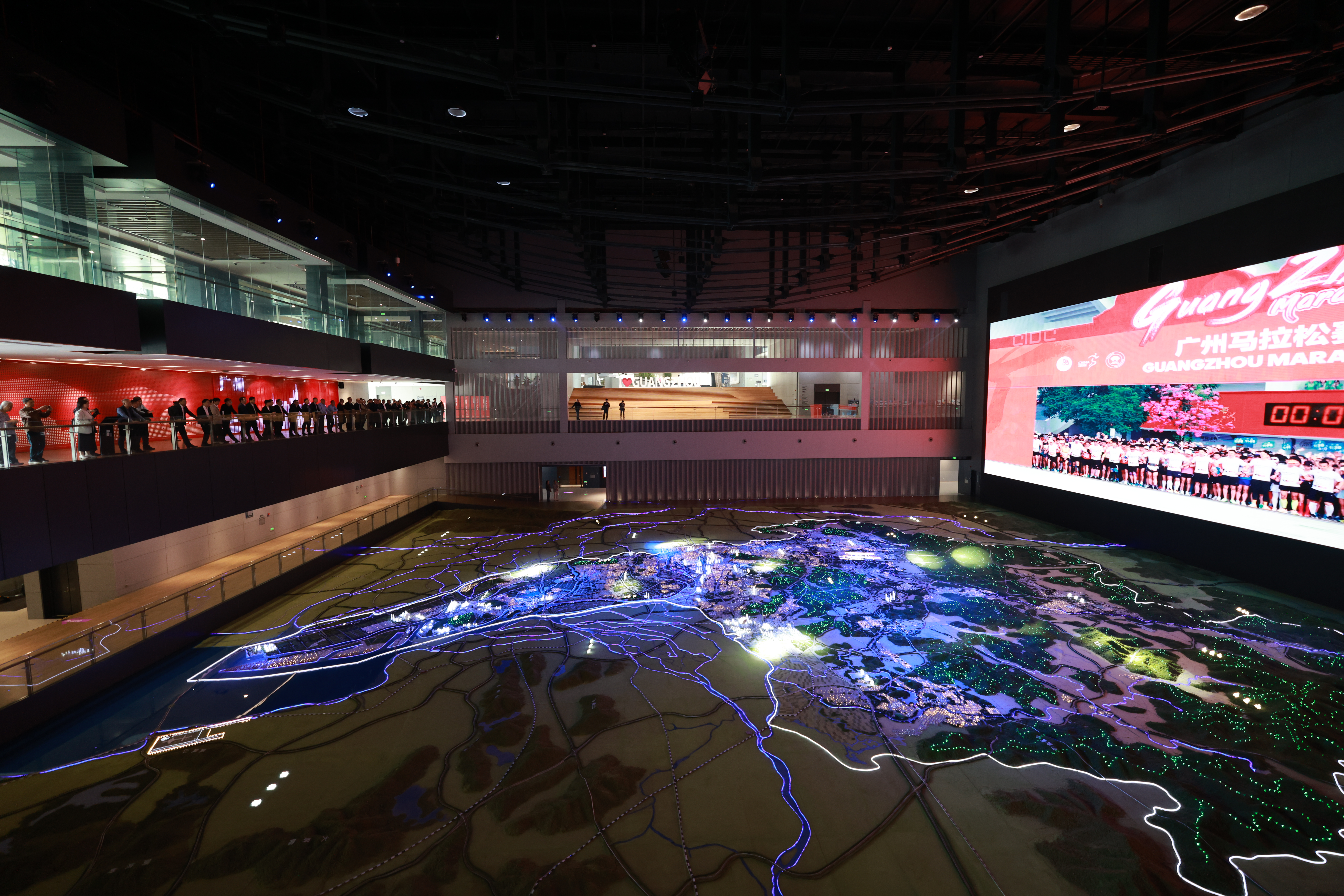 步入展览中心序厅,一面透光混凝土墙上,《广州·生长的天际线》缓缓铺开,“六脉渠图”铜雕,勾勒出广州自古代水系延展至现代都市的演进轨迹。从云山珠水到狮子洋入口,从传统中轴线到珠江高质量发展带,广州城市规划的逻辑清晰铺陈:不是简单的空间扩张,而是功能重构与能级跃升。