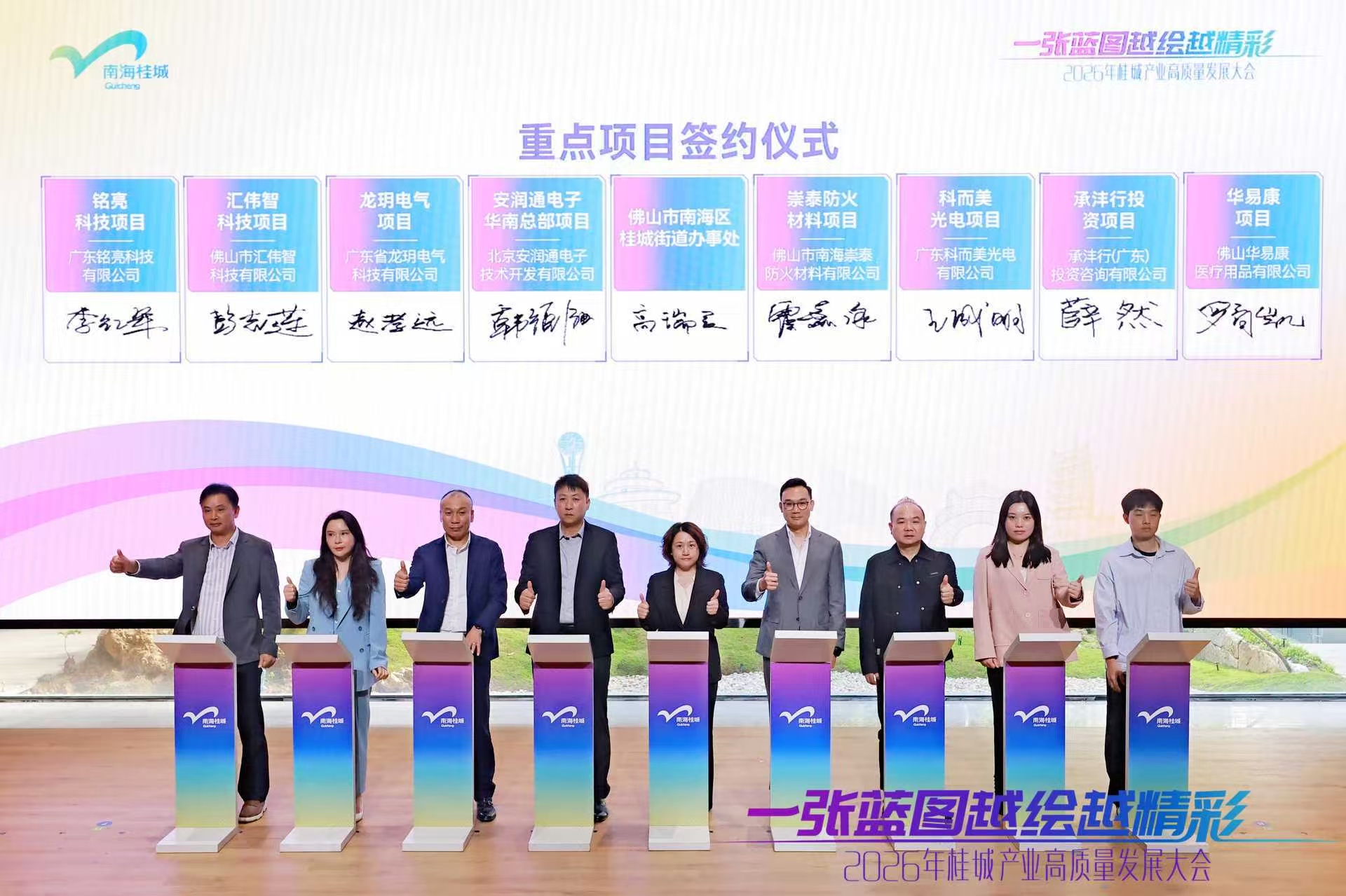 一批重点项目集中签约:崇泰防火材料、安润通华南总部、承沣行投资、龙玥电气、科而美光电、汇伟智科技、华易康、铭亮科技等覆盖人工智能、半导体、生物医药等战略性新兴产业的项目,为桂城未来产业版图注入新动能。