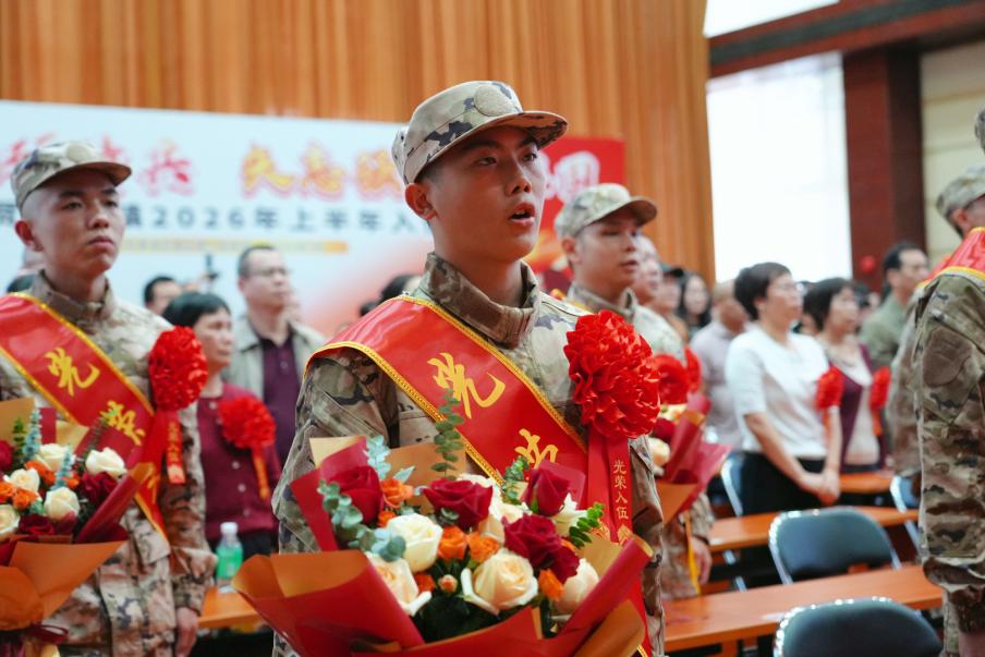 里水镇新兵入伍欢送大会在庄严嘹亮的国歌声中正式拉开序幕。新兵们身姿挺拔、英姿飒爽,整齐的戎装、鲜艳的红花、荣耀的绶带,尽显新时代有志青年的昂扬风貌与担当气魄。
