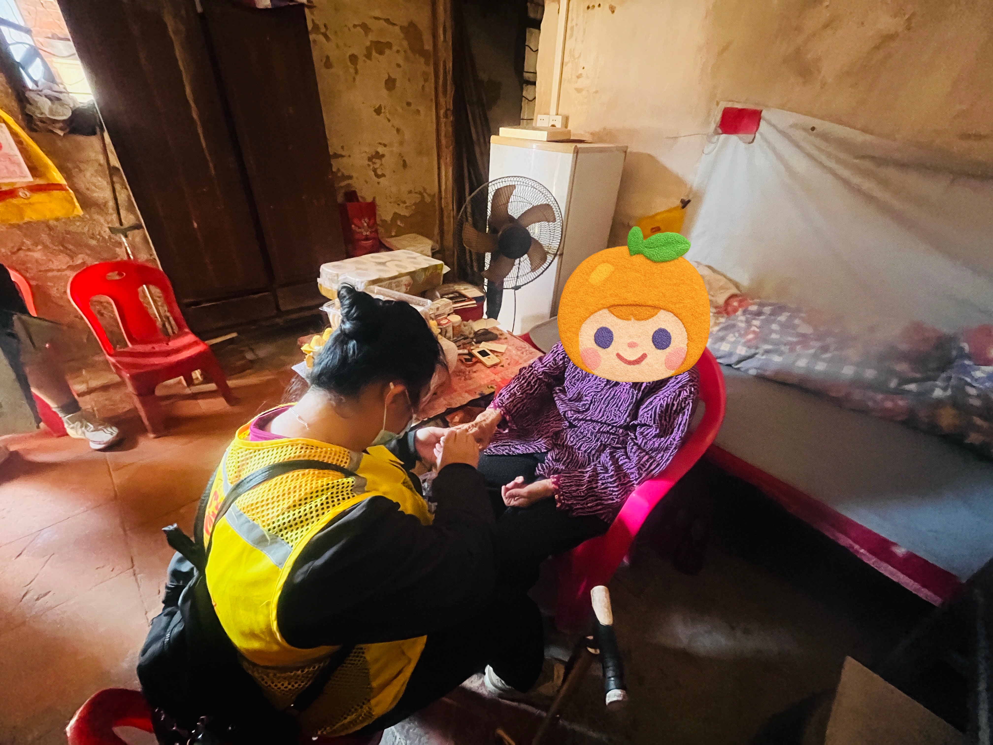 志愿者们分工协作,有的细致清扫房屋,让原本有些昏暗的屋子变得整洁明亮;有的围坐在三婆身边,倾听老人讲述过往的故事和生活点滴,给予情感慰藉。其间,志愿者为三婆测量血压,发现数值偏高后,立即协助老人按剂量服用降压药,并反复叮嘱其要按时服药、注意身体健康。