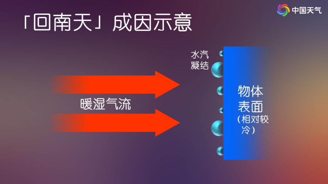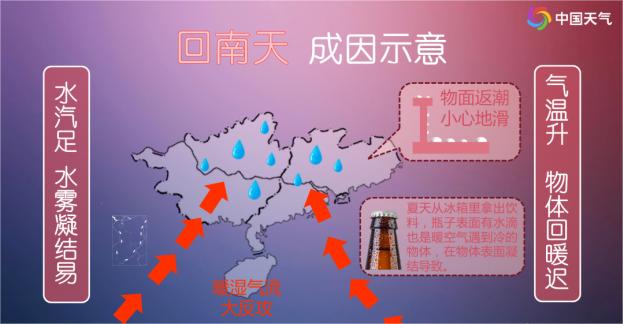 “回南天”的出现,离不开冷暖空气的“默契配合”。这一天气现象通常发生在天气冷暖转换之际:强势的冷空气长时间侵袭后,使墙壁、地板等物体表面“冻透”。冷空气走后,强盛的暖湿气流迅速入侵,与冰冷的物体表面接触后,水汽便会凝结成水珠,形成“回南天”,原理就像夏天从冰箱拿出冰镇可乐,瓶身会快速凝出水珠一样。