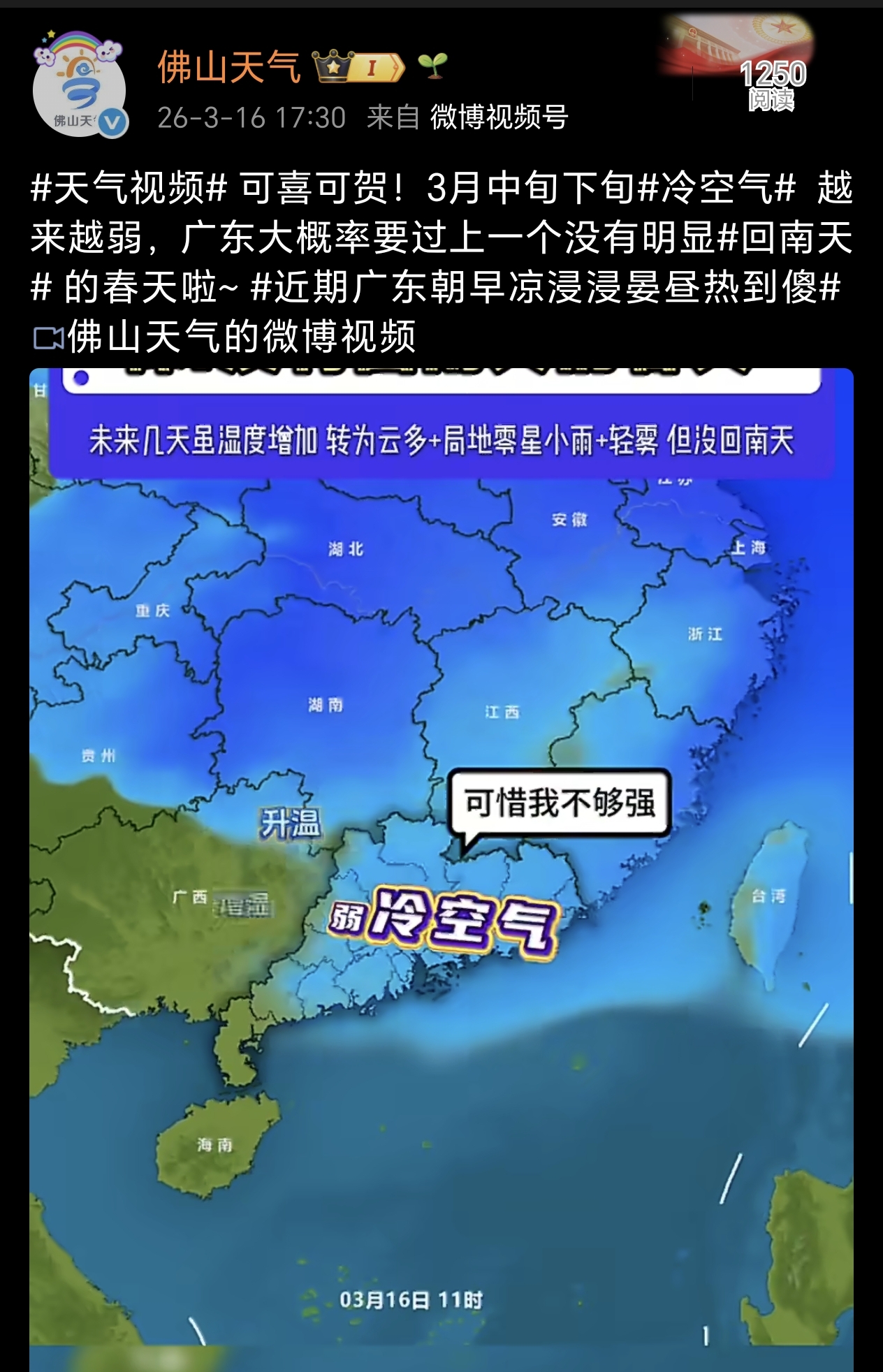 佛山市气象台3月16日发布,今年3月中下旬冷空气势力将持续减弱,广东大概率迎来一个无明显“回南天”的春天,佛山未来一段时间出现“回南天”的可能性较小,市民可告别墙壁“流水”、衣物难干的烦恼。