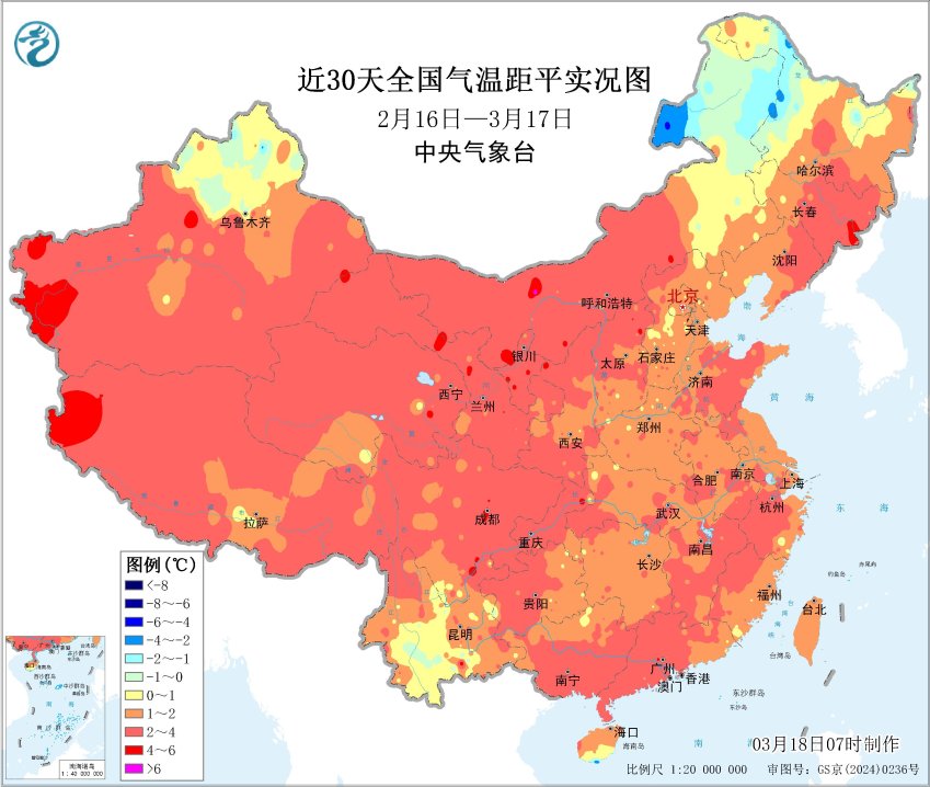 在此期间,共有7次冷空气影响佛山,其中1月6日至10日高明局部出现霜冻,三水国家基本气象站录得今年以来最低气温5.7℃。尽管冷空气活动频繁,但1月1日至3月17日,全市平均气温17.7℃,较常年同期(15.5℃)偏高2.2℃,为有气象记录以来历史第三高。