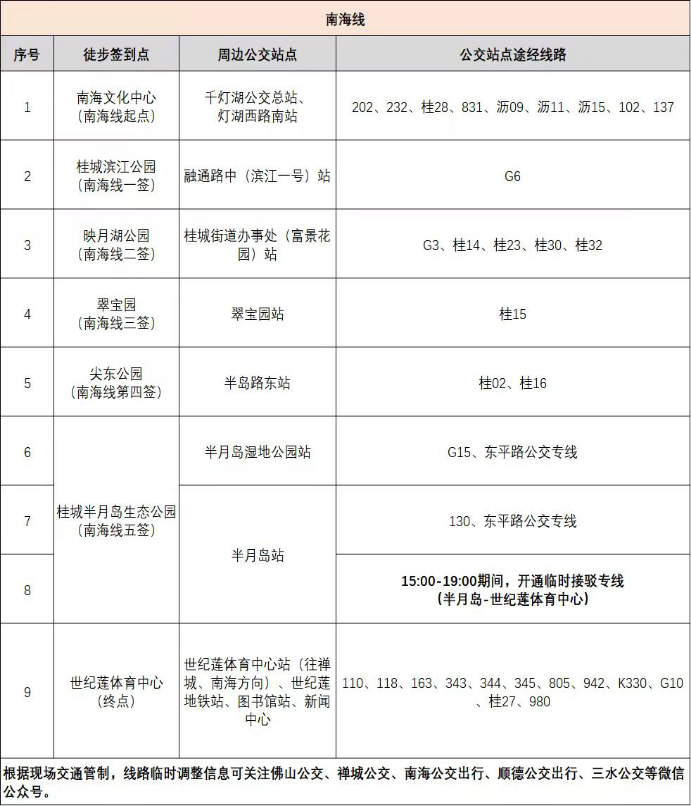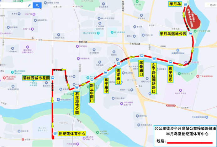 “美丽佛山一路向前”2026年佛山50公里徒步本周六(3月21日)开走!3月19日,记者从佛山公交管理公司南海分公司了解到,活动当天,南海临时开行半岛路—世纪莲接驳专线,方便市民从半月岛单向前往活动终点。