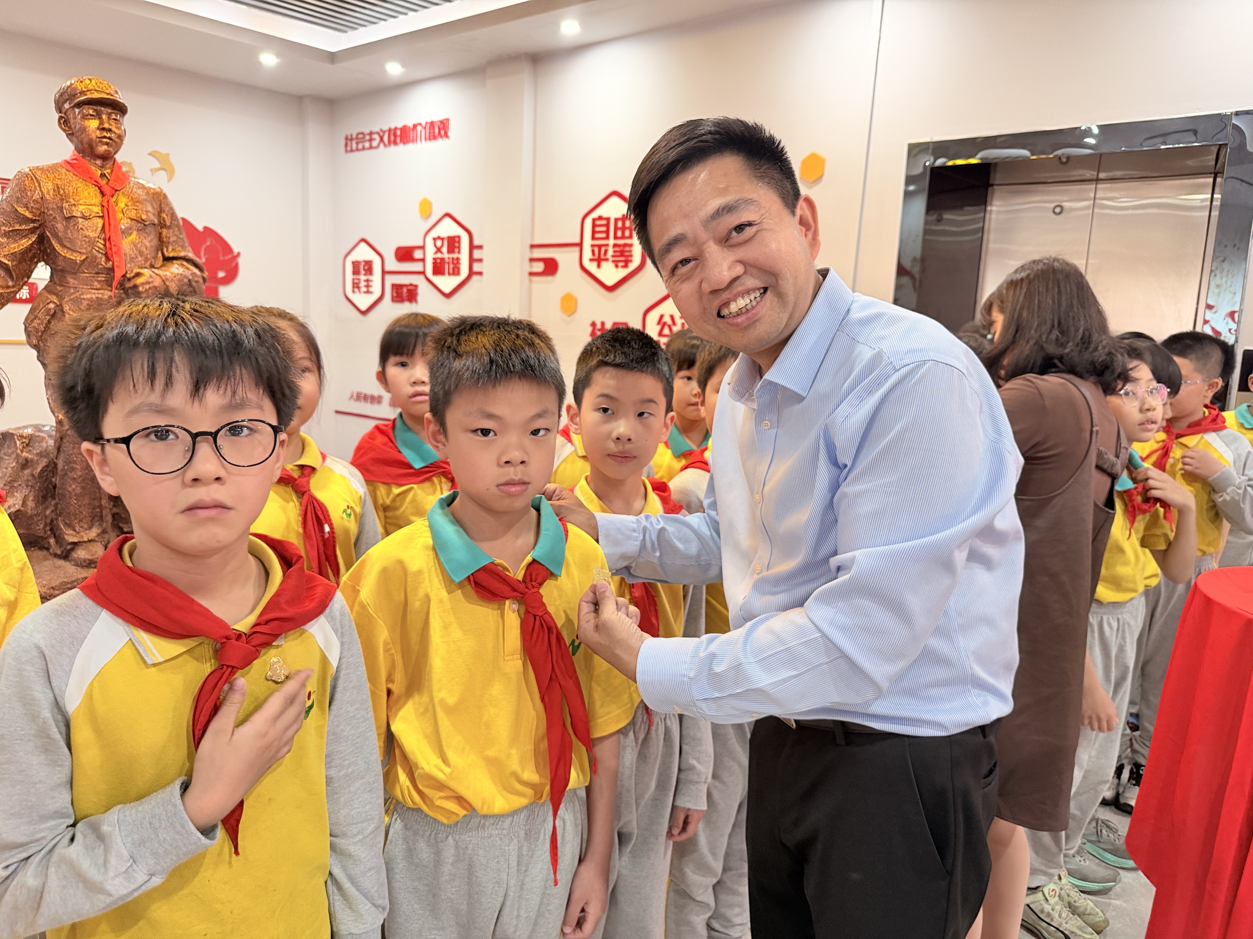 在雷锋像“永恒的丰碑”见证下,南海实验小学党支部书记、校长潘光志与佛山雷锋文化馆馆长陈健帆,共同为学生佩戴熠熠生辉的雷锋像章。一枚枚小小的徽章,不仅别在胸前,更将“无私奉献、乐于助人”的精神种子,悄然播撒进每一位学生的心田,定格下少年们坚定向往的光荣瞬间。