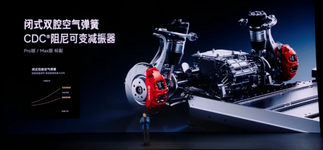动力系统也悄悄换了新东西,全系用上V6s Plus电机,标准版和Pro版马力从299提到320,Max版从673提到690。续航方面变化更大,标准版和Pro版直接从400V平台跳到752V高压平台,充电快多了——标准版15分钟能跑450公里,Pro版能跑490公里,续航也涨到了720公里和902公里。Max版更猛,直接迈进900V阵营,15分钟补能670公里,续航冲到835公里。底盘方面,Pro版终于也能配上双腔空气悬架和CDC减振器了,这以前可是Max版专属的。