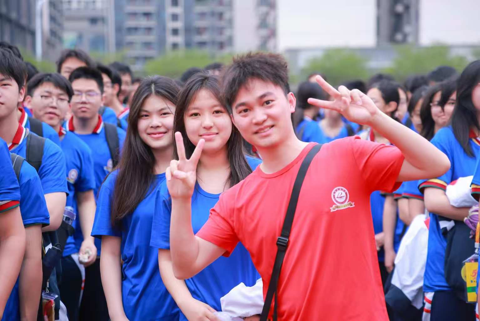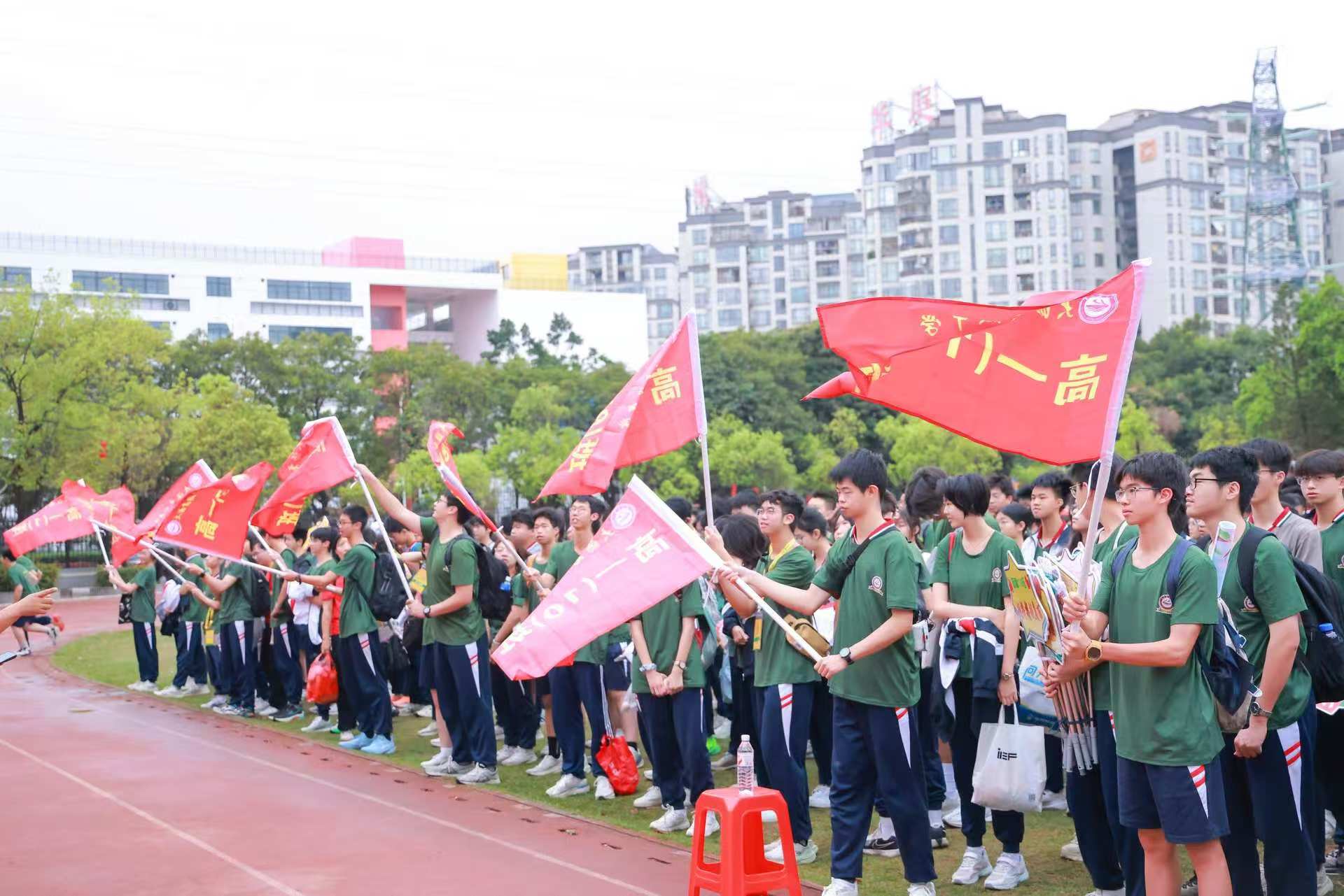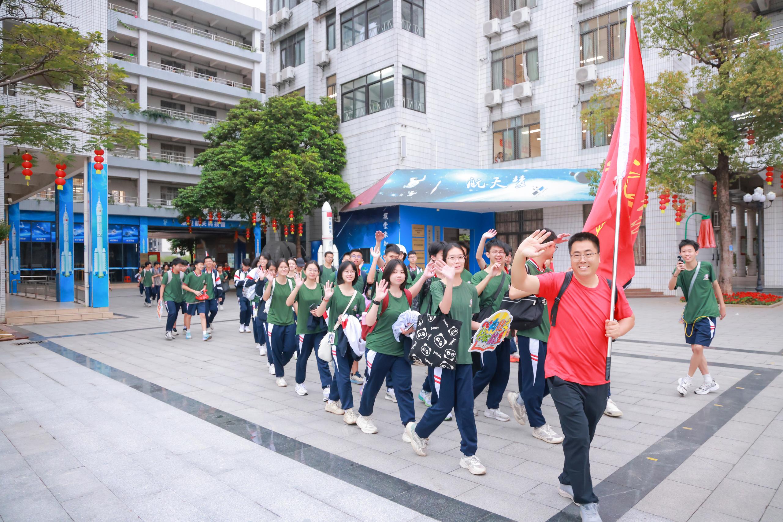 出发前,师生们在操场集结整装。高一学子统一身着“军营绿”,彰显学校国防教育底色;高二学子统一身穿“航天蓝”,寓意承载着科创航天梦想;教师队伍统一身着“党旗红”,意味着要带头冲锋、全程护航!