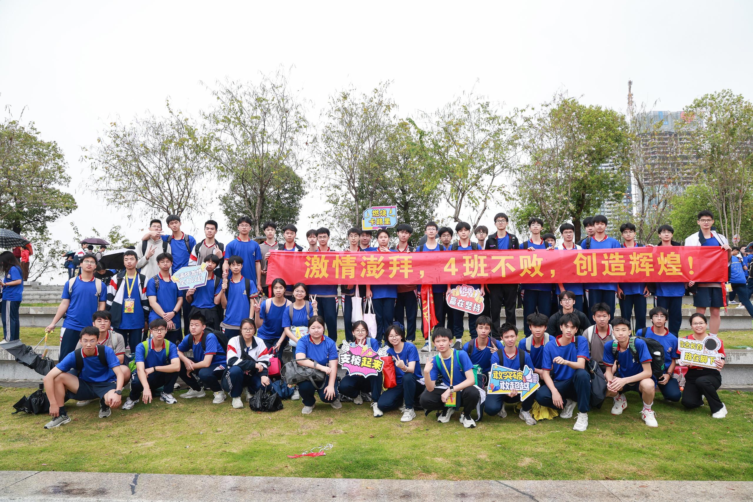 各班喊着专属口号相互鼓劲,“步履昂扬,勇毅无疆!”“意气飞扬,势不可挡!” 的呐喊声回荡在徒步路上。