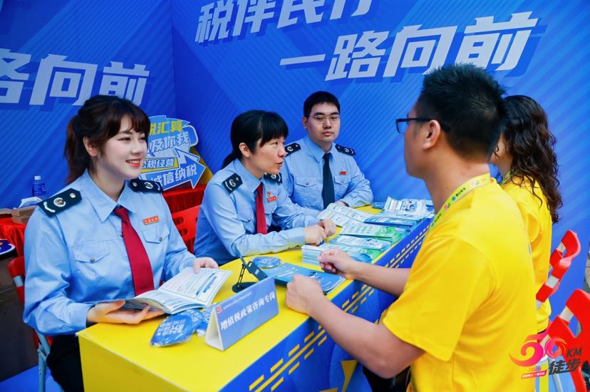 区税务局工作人员为徒步者提供政策指引。