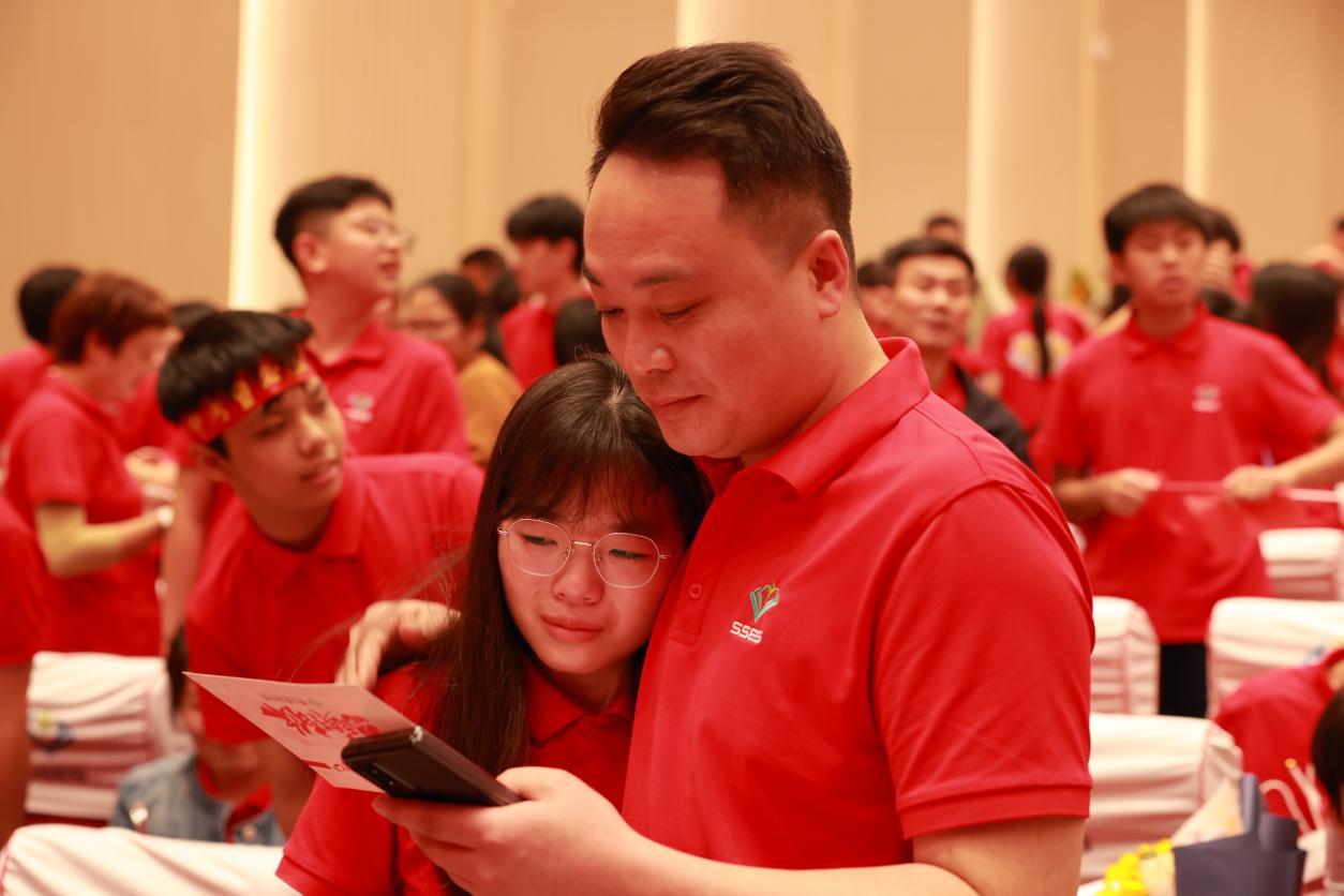 “老豆,爱无需多言”“感谢爸爸妈妈支持我来到狮山实验学校”……大会特设感恩互动环节,学子们向父母朗诵感恩心语、赠送心意卡片,一句句真挚告白、一个个温暖拥抱,尽显少年成长中的责任与担当,让在场家长深受触动。
