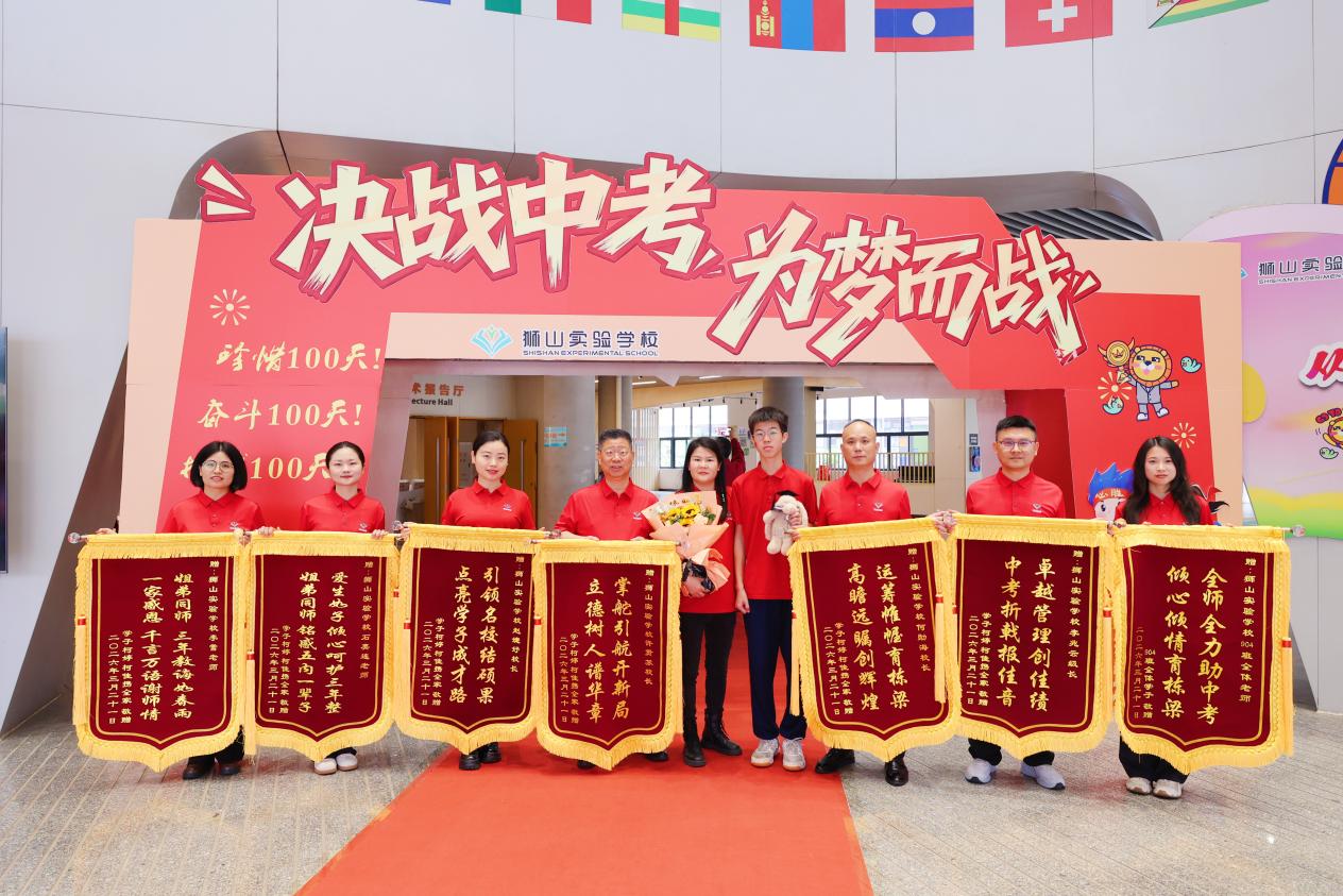 现场还上演了暖心的致谢一幕:904班家长柯冬梅女士专程向学校赠送七面锦旗,为学校“气质教育”的卓越育人成果点赞。据了解,其女儿柯婷从狮山实验学校毕业后升入九江中学,保持成绩优异、表现突出;儿子柯佳六年级便成功入选南海区少年科学院,如今正全力备战中考,对未来满怀憧憬。姐弟二人在学校的悉心培育下,一步步实现从优秀到卓越的成长蜕变,正是学校“六高”(高质量备课、高质量课堂、高质量作业、高质量自习、高质量辅导、高质量考试)教学体系卓有成效的生动缩影。