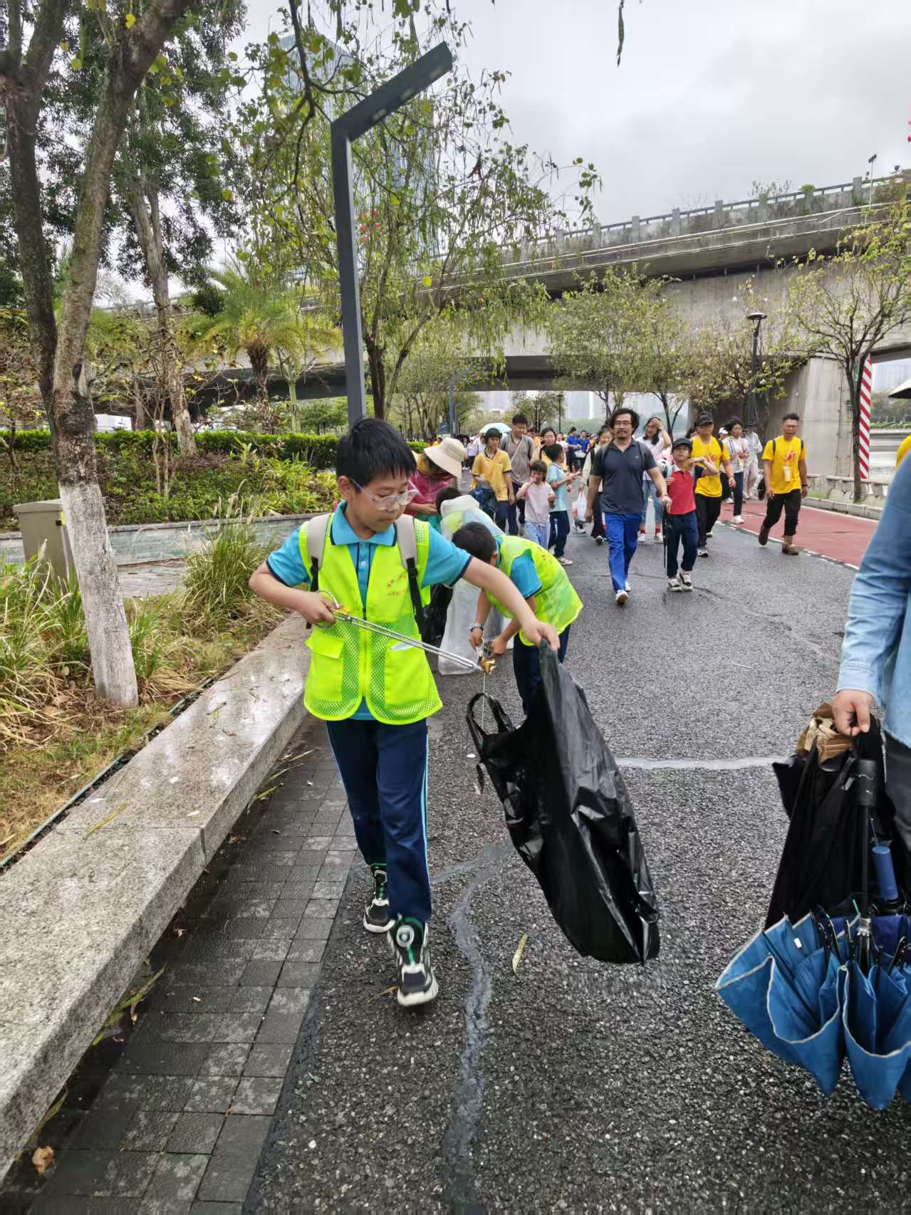 当天早上八点,南海文化广场出发口,灯湖小学的亲子家庭早已整齐集结。孩子们身着统一绿马甲,手里紧紧攥着垃圾袋,身旁家长细心叮嘱捡拾要点,眼神里满是期待与认真。随着徒步大军启程,这支特别的队伍开启“边走边捡”模式,化作一道流动的环保风景线。
