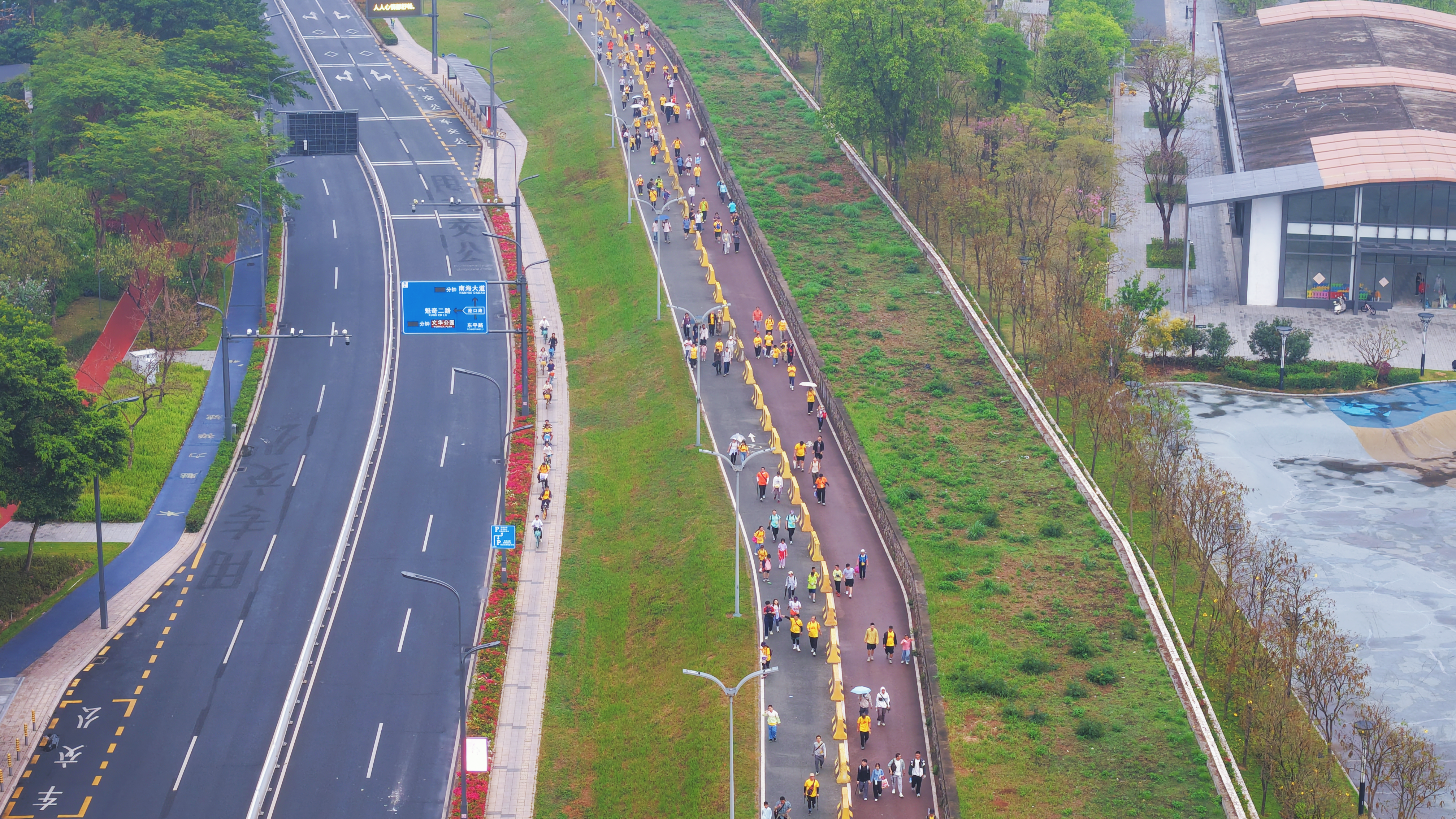随着镜头拉升至高空,整条徒步线路尽收眼底,开阔感扑面而来。航拍画面中,徒步者沿着线路有序前行,即使细雨微凉,大家依旧步履不停、热情不减。人流如潮的壮观景象,在高空视角下更显磅礴有力,展现出“佛山之心”独有的活力与韧性。