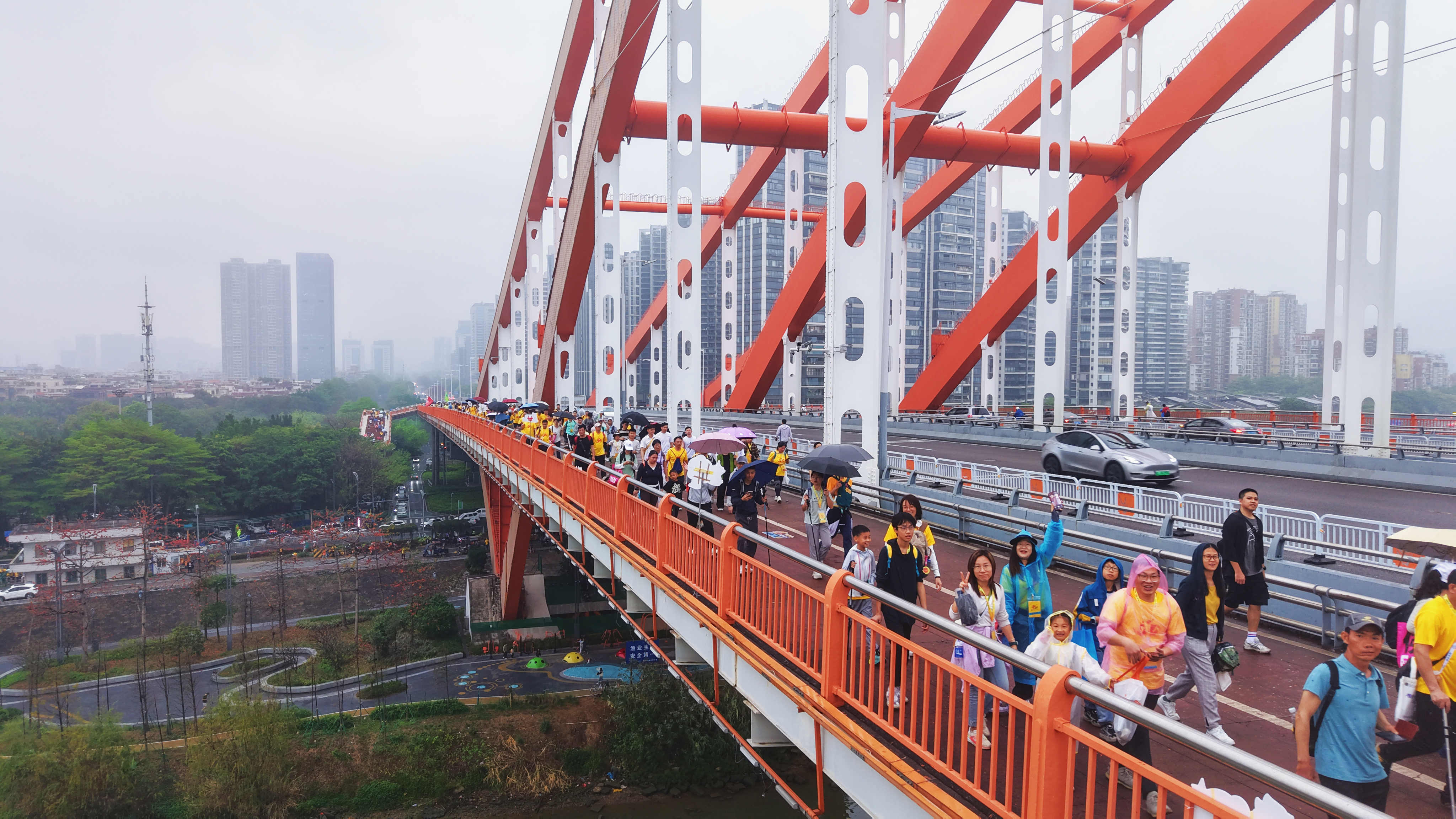 禅城汾江桥上人流如织。市民步履不停穿梭而过,以脚步丈量城市,尽享春日汾江风光。图/佛山市新闻传媒中心记者周春