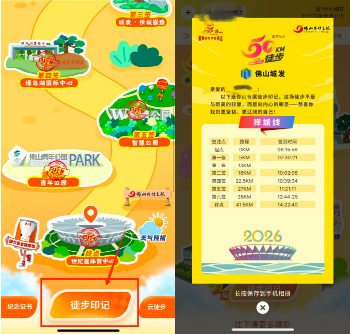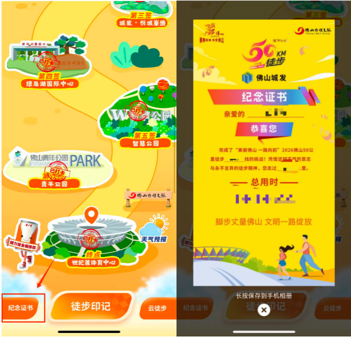 Q6:除了长按保存图片到相册的办法之外,一年之后,如何查看2026年佛山50公里徒步的专属个人电子证书?
