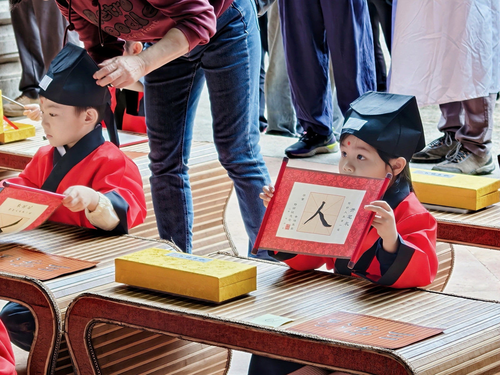 小朋友体验古代学子入学第一课。