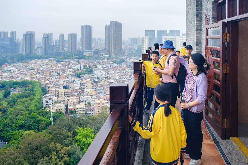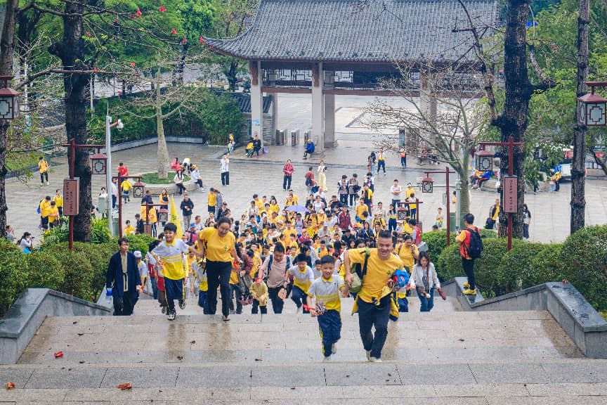 队伍经自华道来到青云梯,300多级石阶蜿蜒而上,每一级都承载着“青云直上”“步步高升”的寓意。青云梯下,全体师生家长集结列队,学校副校长刘光何在攀登前作动员讲话。“同学们,今天我们脚下的青云梯,有340多级台阶。每登一级,就离目标更近一步。”他叮嘱大家,登高途中牢记“健康第一、安全第一”的宗旨,“此次登高,就像大家的求学之路,会遇到困难,但只要坚持下来,站在顶上的那一刻,你会发现一切都值得。”随后,大家跟着书院讲解员的引导,边听佛山状元故事,边拾级而上,体会古人“十年寒窗”的坚韧与执着。