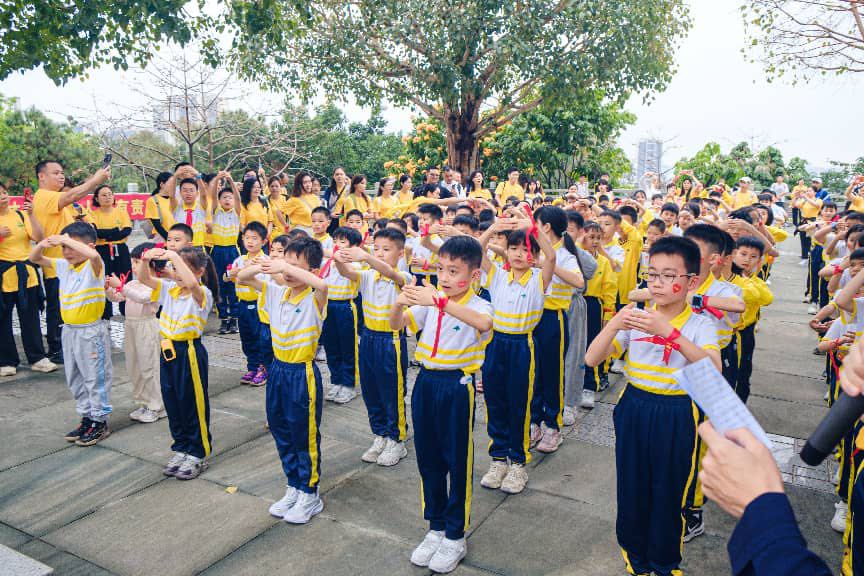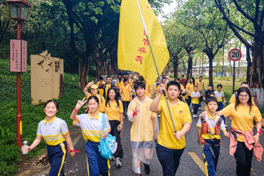 上午九点许,400余名师生家长在魁星书院讲学堂集合,作为书院的核心文化活动场所,讲学堂内有藏书5000余册,常年举办中国文化与哲学讲座、亲子阅读、非遗体验等文化活动。孩子们在此驻足参观,感受书香氛围,不少家长表示,这里是家门口浸润传统文化的好去处。随后,队伍沿自华道有序出发,教师们不时停下脚步,沿途讲解宫粉紫荆、木棉树等植物知识。
