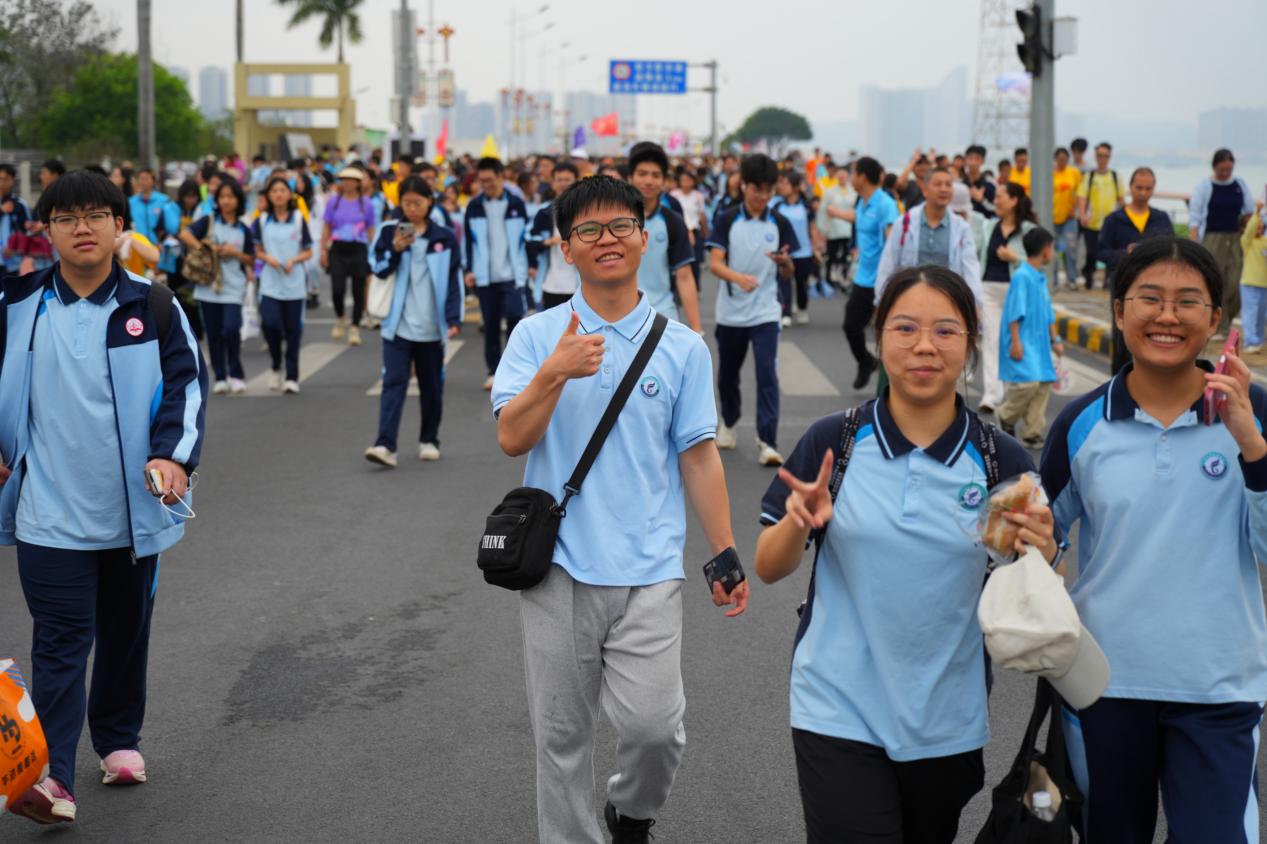 下午3:30,佛高学子谢仲延和陈睿坚高举高一年级大旗率先到达50公里徒步终点。傍晚时分,世纪莲体育中心终点的欢呼声冲破云霄。全程挑战成功的学子们陆续抵达,疲惫的脸庞上写满自豪。高一年级主任刘传星,工会主席罗荣华全程陪伴,数十名教师全程守护,他们与学生并肩而行,用一句句鼓励驱散疲惫,以一次次搀扶传递力量。家委护航天团以细致入微的付出温暖全程,让徒步之路充满安心与感动。“路虽远,行则将至;事虽难,做则必成。”高一(20)班区翔宇说,学习就像徒步一样,每一步都要脚踏实地,方能抵达目标。