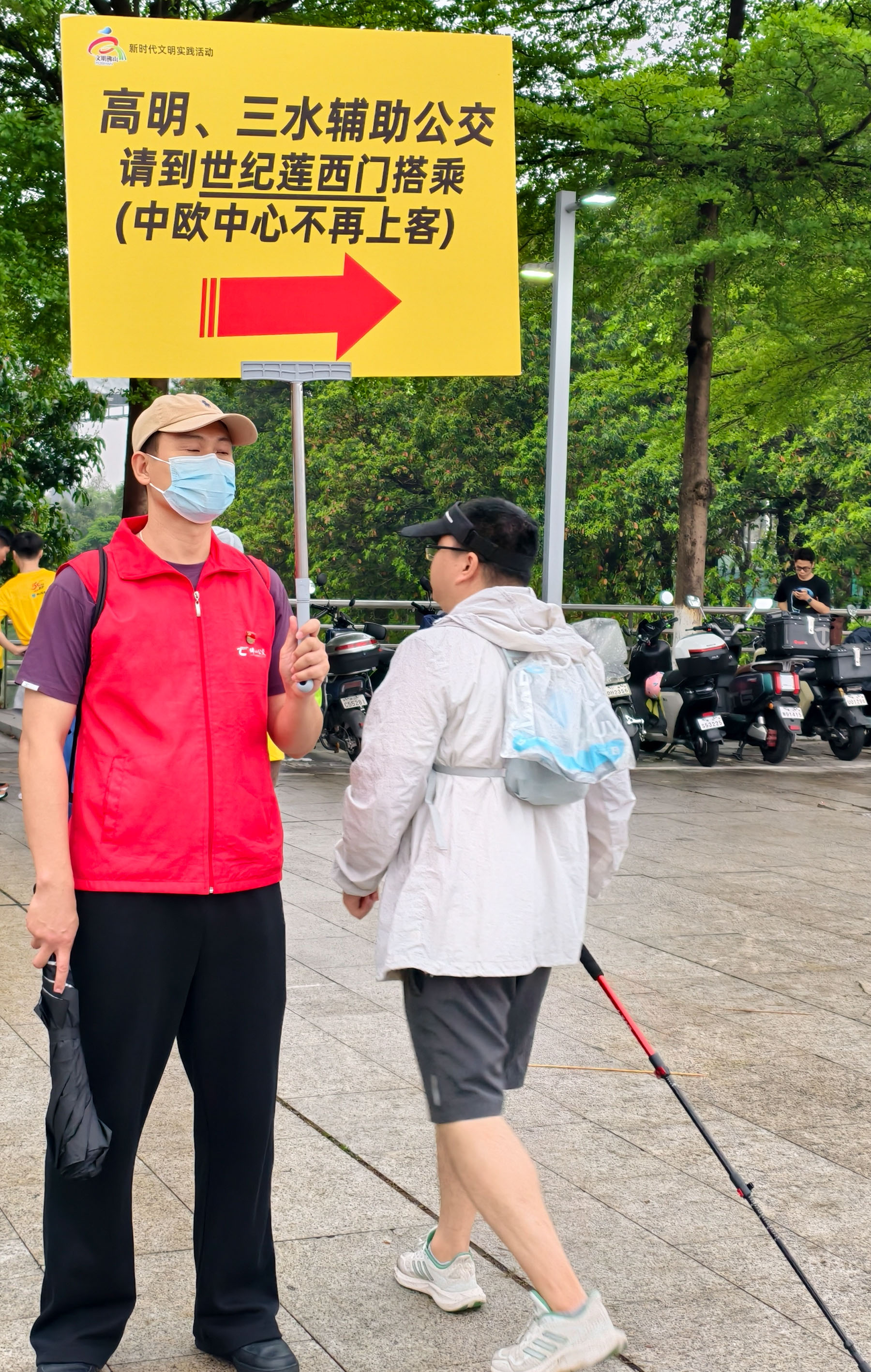 在世纪莲体育中心,佛山市公共交通管理有限公司的党员志愿者手举交通指引牌为市民服务。