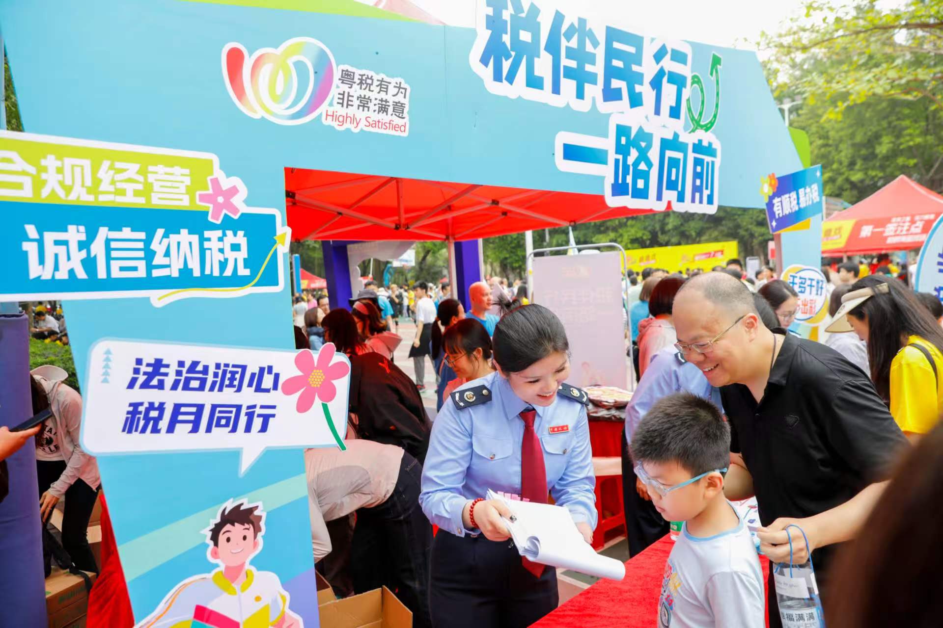 在顺德线第一签注点桂畔篮球场,顺德税务人员特别设置了“税动方向·行稳致远”宣传活动区,以互动游戏的形式普及税法知识,吸引众多徒步市民驻足参与。