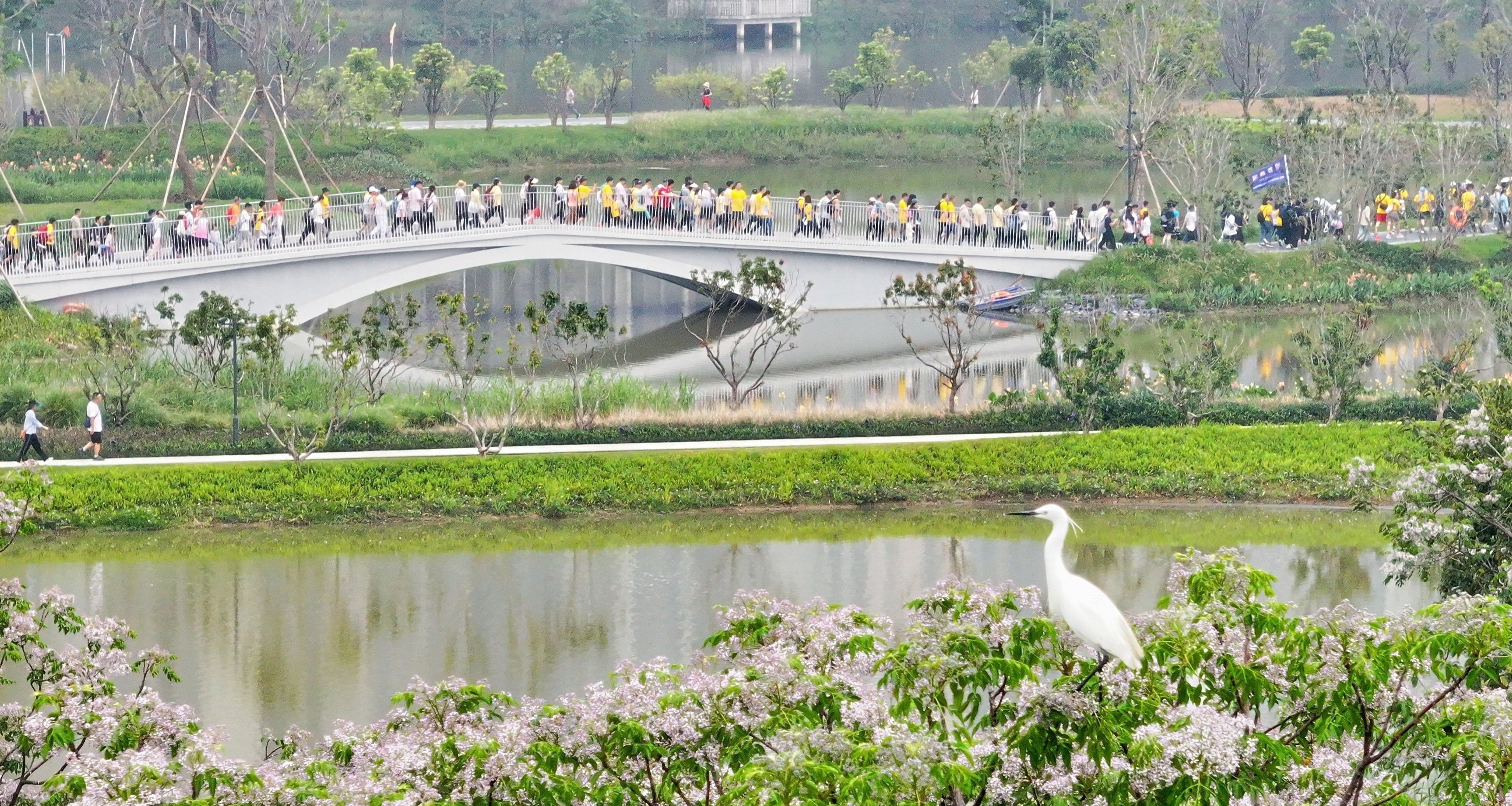清晨,烟雨朦胧中,徒步者沿着云鹭湿地公园的碧道蜿蜒向前,春水盈盈,草木葱茏。行至此处,云鹭美景尽收眼底——一池碧水倒映着天空,岸边绿枝随风轻摇,抬头是春日繁花盛开,远处的绿树层层叠叠,勾勒出一幅宁静而生机盎然的春日图景。时有白鹭掠过水面,身姿灵动轻盈;更多的徒步者则放慢脚步,静静欣赏这美丽春光。