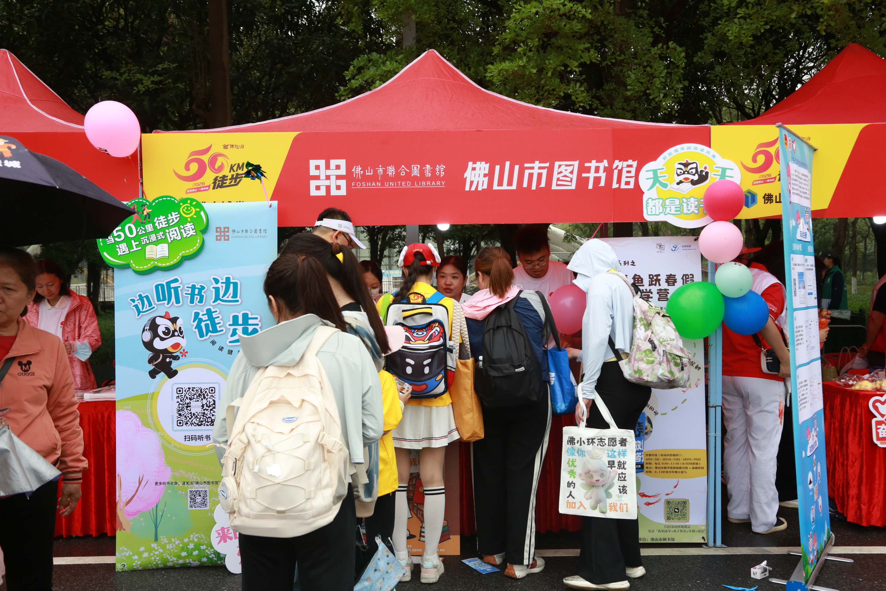 今年是佛山市联合图书馆体系建设21周年,从“阅读方阵”到“流动书房”,图书馆服务再次深度融入城市盛事。3月21日,在“美丽佛山 一路向前”2026佛山50公里徒步活动现场,佛山市图书馆携手五区图书馆,以“阅行全城,联图相伴”为主题,将整条徒步线路装点成一座流动的“城市阅读走廊”。